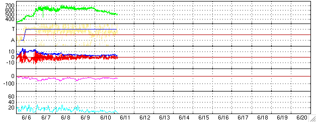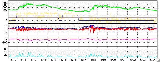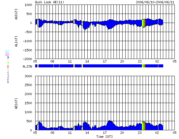 ACEが観測した太陽風の磁場(1番上の枠、白線は全体の強度、赤線は南北成分) および、太陽風の密度(3番目の橙線)、速度(4番目の黄線) (c) NOAA/SEC ![]() リアルタイムAE指数 下段のAEグラフの値が高くなると、オーロラ活動が活発化しています。 (c) 京都大学, NICT ![]() 27日の太陽周期に合わせたデータプロット (太陽風版) 太陽が同じ面を地球に向けていた27日前の変化から、今後を予想することができます。 (c) NICT