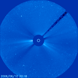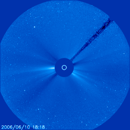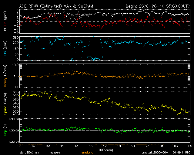 2006/ 6/11 13:50 更新 太陽風の速度が下がり始めています(500km/秒)。放射線帯の高エネルギー電子は高いレベルが続いています。 担当 篠原 太陽風の速度が低下を始めています。 昨日のニュースの時点では630km/秒とかなり高速だった太陽風ですが、 その後、ゆっくりと低下を始め、現在は500km/秒まで下がりました。 GOESのX線写真では、コロナホールは既に西に遠ざかっており、 地球は高速風領域から抜け出しつつあります。 今日から明日にかけて、速度は引き続き低下し、穏やかな太陽風に戻るでしょう。 太陽風磁場は弱い南寄りになっています。 ACEのグラフでは、-2nT程度の振幅で南を向いている時間が目立っています。 この影響で、300〜500nT程度の小規模のオーロラ活動が引き続き発生しています。 これから更に速度が下がると、オーロラの活動も次第に小さくなって行きます。 放射線帯の高エネルギー電子は高いレベルを保っています。 数値としては、昨日よりもやや増加していますが、太陽風の速度が下がり始めていますので、 この辺りが最高値になるでしょう。 数日かけてゆっくりと低下して行きますので、しばらくの間、衛星の運用では注意が必要です。 太陽では、11日2時(世界時10日17時)に、892黒点群でB6の小さなフレアが発生しています。 GOESのX線動画を見ると、長時間型に似た光り方をしていて、 CMEの発生が考えられます。 そして、SOHOのLASCO C2, C3の写真では、最新の写真でかすかに、 halo型のCMEが飛び出しつつあるように見えます (太陽の上側に、ほんの少しですがガスが広がって見えます)。 明日になれば、詳しく状況が分かるでしょう。 フレア自体はとても小規模ですので、CMEが発生したとしても小規模です。 892, 983の2つの黒点群は、黒点の見え方としては昨日よりも縮小しています。 太陽は穏やかな状態が続くでしょう。 GOES衛星のX線カメラで撮影した太陽の様子。コロナホールを見るために強調処理をしている。11日13時 (世界時11日04時)。 (c) NOAA/SEC ![]() SOHO衛星のLASCO C3カメラの映像 (c) SOHO (ESA & NASA)