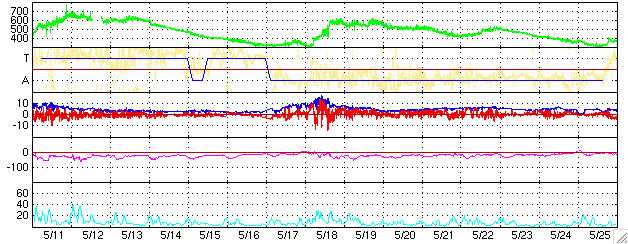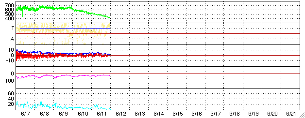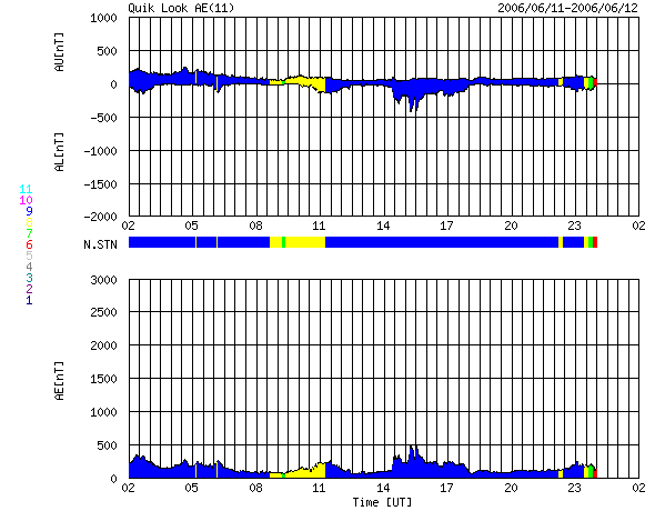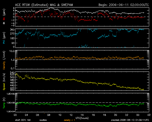 2006/ 6/12 10:10 更新 太陽風は速度が下がり、穏やかになっています(400km/秒)。 担当 篠原 太陽風はゆっくりと速度を下げ続け、500km/秒から400km/秒へ下がりました。 通常の速度レベルに戻っています。 太陽風の磁場強度も4nTから2nTへ弱まっています。 南北成分では、-2nT程度の弱い南向きが発生しています。 速度が低下していることもあり、小規模のオーロラ活動が見られています。 AE指数に300nT程度の変化が見えています。 地球から見ていると、太陽は約27日で一回転します。 そのため、太陽風の変化も27日の周期で同じ変化を繰り返す性質があります。 その様子を見るために、現在と27日前の変化を並べて27日周期の図を作成しています。 6月6日に始まった今回の高速風も、この図を見ると、 27日前の5月11日から5月15日にかけて、とても似た変化が発生していたことが分かります。 この図を見ることで、今後の太陽風の予想を立てることができます。 今日(6月12日)の27日前は5月16日です。 そこでは、太陽風は高速風を抜けた後で更に速度を下げ、更に穏やかになっています。 そして、5月17日に磁場強度が強まり(青線)、翌日5月18日の高速風へと繋がっています。 これを現在の日付に読み替えると、明日、6月13日頃から磁場強度に変化が始まり、 明後日、6月14日頃に速度の上昇が始まるという風に予想することができます。 速度が上がり始める6月14日頃に、磁気圏活動も活発になりそうです。 GOES衛星のX線写真を見ると、太陽の中心から南寄り(下寄り)に、淡いコロナホールが見えている様です。 おそらくこの領域の影響が、これからやってくるのでしょう。 コロナホールのすぐ上には、新しく明るい活動領域(黒点群)ができています。 これは27日前には見られなかったものです。 この部分の変化が、太陽風の変化にどのように影響しているかも注目されます。 放射線帯の高エネルギー電子は高いレベルを保っています。 密度はやや減少していますが、依然10の4乗のレベルを越えています。 引き続き注意が必要でしょう。 太陽のフレア活動は穏やかです。 Bクラスに達するか達しないかというとても小さな変動は見られていますが、 目立った規模の活動には繋がっていません。 昨日の写真と比較すると、黒点群の規模は縮小しつつある様です。 GOES衛星のX線カメラで撮影した太陽の様子。コロナホールを見るために強調処理をしている。12日00時 (世界時12日00時)。 (c) NOAA/SEC ![]() ACEが観測した太陽風の磁場(1番上の枠、白線は全体の強度、赤線は南北成分) および、太陽風の密度(3番目の橙線)、速度(4番目の黄線) (c) NOAA/SEC ![]() リアルタイムAE指数 下段のAEグラフの値が高くなると、オーロラ活動が活発化しています。 (c) 京都大学, NICT ![]() 27日の太陽周期に合わせたデータプロット (太陽風版) 太陽が同じ面を地球に向けていた27日前の変化から、今後を予想することができます。 (c) NICT
