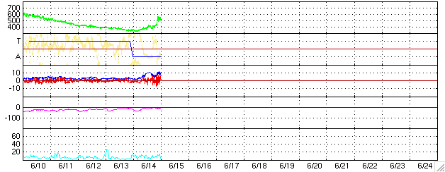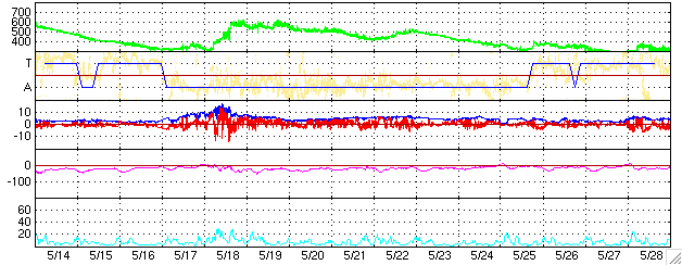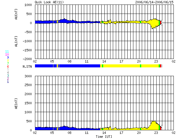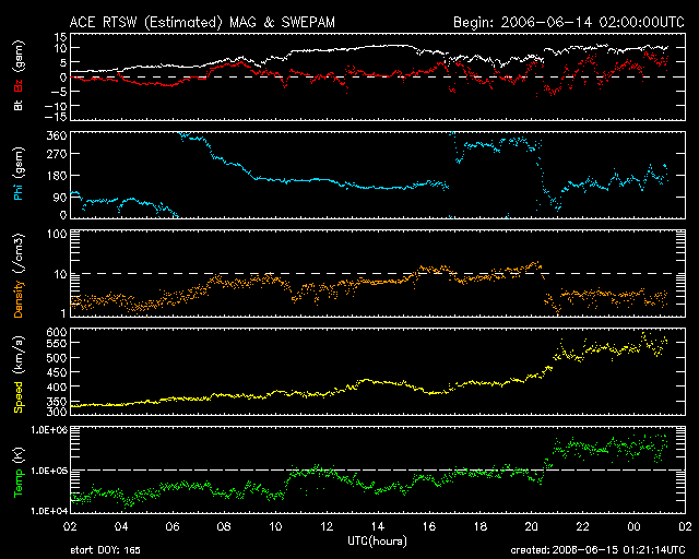 2006/ 6/15 10:22 更新 コロナホールによる高速風が回帰して来ました。速度が上昇しています(550km/秒)。 担当 篠原 27日前の前周期に見えていた、高速風領域が再びやって来ました。 昨日のニュースの後より、太陽風の磁場強度がじりじりと上昇を始めました。 高速風が来る前触れとなる変化です。 14日21時(世界時14日12時)頃には、10nTに達しています。 そして、これに続いて、太陽風の速度もまたゆっくりと上昇を始めました。 本格的に上がり始めたのは15日4時(世界時14日19時)頃からで、 400km/秒から6時間ほどかけて現在の550km/秒に達しています。 27日周期の図で前回の変化を振り返ると、高速風の到来は半日ほど遅くなった様です。 前回は最高の速度が600km/秒くらいでした。 今回も既にその速度に近づいていますが、 速度の上昇が終わる前には磁場強度が下がります。 現在の太陽風を見ると、磁場強度は10nTと高い状態を保ち続けています。 従って、もうしばらくは上昇を続けそうです。 磁場強度が下がり始めれば、速度の上昇も終わりを迎えます。 オーロラ活動に影響を与える、太陽風磁場の南北成分は、 ここまではあまり南向きになっていません。 そのためAE指数の変化も、短時間500nT変化した程度で限定的です。 ACEの図では最後の部分も北寄りで、この状況では磁気圏は穏やかに推移するでしょう。 今後、南寄りに傾向が変わると、オーロラ活動も強められます。 放射線帯の高エネルギー電子は、高速風が来るまでは高いレベルを保っていました。 しかし、現在、磁気圏が高速風の影響を受けていますので、 高エネルギー電子が急速に減少する可能性があります。 今後の変化が注目されます。 太陽のフレア活動はおだやかです。 X線の強度が上昇していますが、これは西の端に沈みかけている活動領域が明るくなったためで、 このあと沈んで行きますから、今後の影響はありません。 893黒点群は、掲載の写真では見えなくなっています。 この後も、太陽は穏やかな状態が続くでしょう。 GOES衛星のX線カメラで撮影した太陽の様子。コロナホールを見るために強調処理をしている。15日10時 (世界時15日01時)。 (c) NOAA/SEC ![]() ACEが観測した太陽風の磁場(1番上の枠、白線は全体の強度、赤線は南北成分) および、太陽風の密度(3番目の橙線)、速度(4番目の黄線) (c) NOAA/SEC ![]() リアルタイムAE指数 下段のAEグラフの値が高くなると、オーロラ活動が活発化しています。 (c) 京都大学, NICT ![]() 27日の太陽周期に合わせたデータプロット (太陽風版) 太陽が同じ面を地球に向けていた27日前の変化から、今後を予想することができます。 (c) NICT