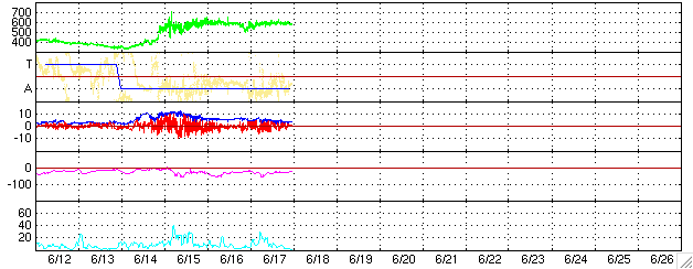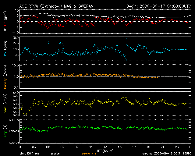 2006/ 6/18 09:33 更新 太陽風は高速の状態が続いています(580km/秒)。これから次第に低下に向かうでしょう。 担当 篠原 高速の太陽風が続いています。 昨日より、速度は580km/秒と高い値で安定しています。 27日周期の図で見ると、前周期よりも高速の状態がより高いレベルで続いていて、 高速風領域としては規模が拡大している様です。 一方、太陽風の磁場は5nTから3nTくらいにやや弱まっています。 わずかな変化ですが、高速風が後半に入った事を示していると思われます。 まだしばらく現在のレベルが続くかもしれませんが、次第に低下に向かっていくでしょう。 磁場の南北成分は-3nTくらいの弱い南向きが見られています。 この影響で500nT規模のオーロラ活動が発生しています。 それほど大きな擾乱ではありません。 太陽風は高速で続いていますが、 磁場強度が下がっていることや、速度も次第に低下していくことから、 今後のオーロラ活動は次第に小規模になっていくでしょう。 昨日、増加の傾向を示していた放射線帯の高エネルギー電子ですが、 今のところ、そこまでで増加は止まっています。 警戒ラインよりはやや下です。 高速風は現在も続いていますので、今後の変化に対して引き続き注目する必要はあります。 太陽は無黒点のままです。 X線の変化も小さく、フレア活動はとても穏やかです。 SOHO衛星のEIT284カメラの映像 (c) SOHO (ESA & NASA)