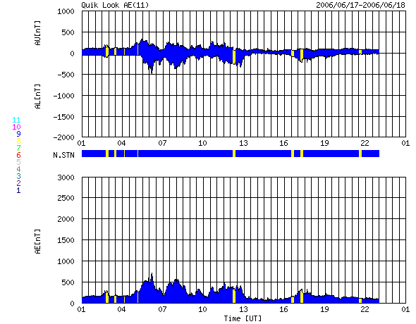 ACEが観測した太陽風の磁場(1番上の枠、白線は全体の強度、赤線は南北成分) および、太陽風の密度(3番目の橙線)、速度(4番目の黄線) (c) NOAA/SEC ![]() リアルタイムAE指数 下段のAEグラフの値が高くなると、オーロラ活動が活発化しています。 (c) 京都大学, NICT ![]() 27日の太陽周期に合わせたデータプロット (太陽風版) 太陽が同じ面を地球に向けていた27日前の変化から、今後を予想することができます。 (c) NICT