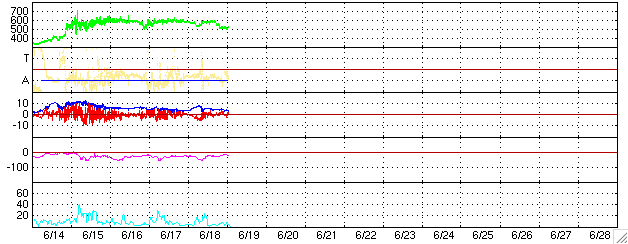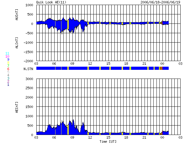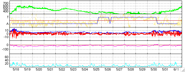 ACEが観測した太陽風の磁場(1番上の枠、白線は全体の強度、赤線は南北成分) および、太陽風の密度(3番目の橙線)、速度(4番目の黄線) (c) NOAA/SEC ![]() リアルタイムAE指数 下段のAEグラフの値が高くなると、オーロラ活動が活発化しています。 (c) 京都大学, NICT ![]() 27日の太陽周期に合わせたデータプロット (太陽風版) 太陽が同じ面を地球に向けていた27日前の変化から、今後を予想することができます。 (c) NICT