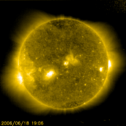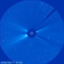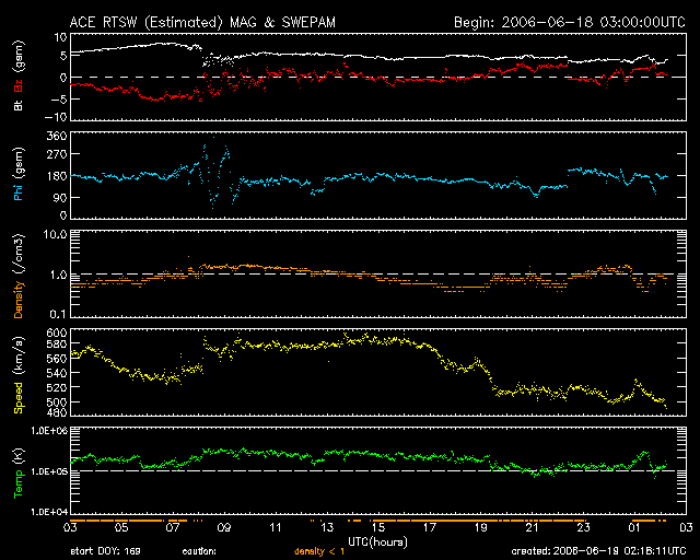 2006/ 6/19 11:20 更新 太陽風の速度がやや下がっています(500km/秒)。地球は高速風領域を抜け出し始めています。 担当 篠原 太陽で、2つの小規模CME(太陽ガスの放出現象)が、連続して発生しています。 SOHOのLASCO C3カメラの動画を掲載します。 南西(右下)と北東(左上)へ向かって、リズム良くふたつの白いガスが飛び出しています。 NOAA/SECによると、発生源は太陽の裏側だとのことで、地球への影響はありません。 (端で起こっていますので、太陽のこちら側だとしても、地球への影響はほとんどないでしょう。) 太陽風は高速状態でがんばっています。 昨日いっぱい、580km/秒と高い速度を保ち続けました。 日付が今日に変わった頃に一段下がって、500km/秒になっています。 それでも、高速の状態です。 27日周期の図で、前回(5月18日以降)と比較すると、高速風の期間は同程度ですが、 速度がより高い状態で安定して続いています。 また、太陽風の磁場では、18日の15時(世界時18日6時)を中心として、 -3〜-5nTくらいの南向きが安定して続く時間帯が見られました。 南向きは5時間くらい続いています。 この時に、一時的にオーロラ活動が強まり、800nTの中規模の変動がAE指数で見られています。 その後は、南北成分は0nTか、北寄りに変わり、磁気圏は静穏になっています。 太陽風の速度が下がり始めたため、これから明日にかけて地球は高速風領域を抜けて行くと思われます。 速度が下がると、磁気圏の擾乱も小規模に留まるようになり、全体的にも静穏になります。 その後は、6月25日頃まで、太陽風は穏やかに推移しそうです。 放射線帯の高エネルギー電子は、磁気圏の乱れの影響でしょう、 10の3乗にレベルを下げています。 警戒ラインからは1桁下がりました。 しかし、高速風が続いていますので、もうしばらく注目する必要があります。 太陽のフレア活動は穏やかです。 あたらしく896黒点群が発生しています。 小規模でほとんど活動は見られません。 SOHO衛星LASCO C3カメラによるCME(太陽ガスの放出現象)。右下と左上に連続して飛び出しています。 (c) ESA & NASA ![]() SOHO衛星のEIT284カメラの映像 (c) SOHO (ESA & NASA)