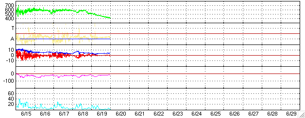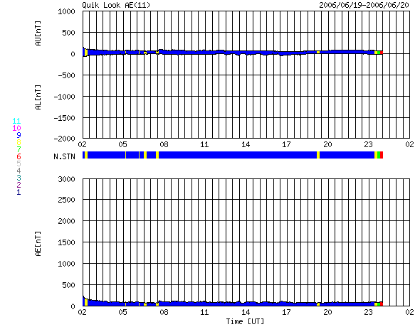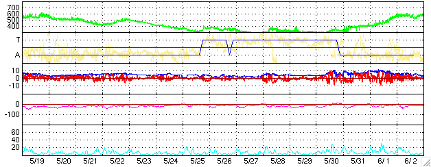 ACEが観測した太陽風の磁場(1番上の枠、白線は全体の強度、赤線は南北成分) および、太陽風の密度(3番目の橙線)、速度(4番目の黄線) (c) NOAA/SEC ![]() リアルタイムAE指数 下段のAEグラフの値が高くなると、オーロラ活動が活発化しています。 (c) 京都大学, NICT ![]() 27日の太陽周期に合わせたデータプロット (太陽風版) 太陽が同じ面を地球に向けていた27日前の変化から、今後を予想することができます。 (c) NICT