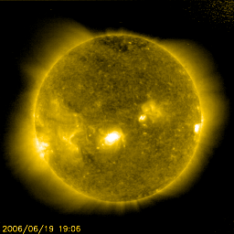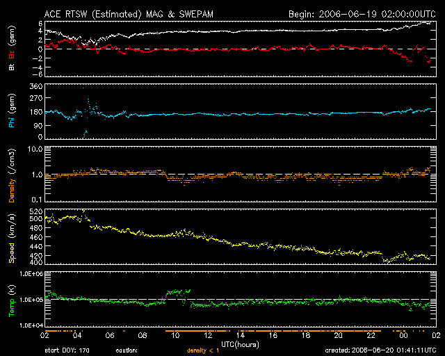 2006/ 6/20 10:42 更新 太陽風の速度が下がりました(400km/秒)。磁気圏も静穏です。 担当 篠原 地球は高速の太陽風領域を抜け出しました。 太陽風の速度は、500km/秒から通常レベルの400km/秒へ一日で下がっています。 太陽風磁場は強度4nTでこちらも通常の強さです。 南北成分はほとんど0nTのところにあります。 速度が下がったこともあり、磁気圏のオーロラ活動はとても穏やかになっています。 AE指数のグラフには全く変化が観測されていません。 ACEの図では、最新の部分で、磁場強度がやや上昇し、磁場が急に南を向く変化が見られています。 小規模の乱れに限定されると思いますが、これから何かの変化が起こるのでしょうか。 SOHO EIT284の太陽写真を見ると、全体的にぼんやりと明るいだけで、 コロナホールの暗い影は見えていません。 これからしばらくの間、穏やかな太陽風が続きそうです。 27日周期の図を見ると、前周期の次の擾乱は、5月30, 31日くらいから始まる高速風です。 これは今周期にあてはめると、6月26, 27日くらいになります。 それまでは低速風状態で推移するのではないでしょうか。 放射線帯の高エネルギー電子は、昨日よりほとんど変化していません。 今回はこれ以上の増加はなさそうに思います。 太陽のフレア活動はとても穏やかです。 太陽の中心に896黒点群が見えていますが、小規模で、活動もほとんど見られません。 太陽も穏やかなまま推移しそうです。 SOHO衛星のEIT284カメラの映像 (c) SOHO (ESA & NASA)