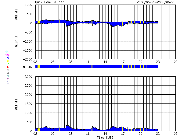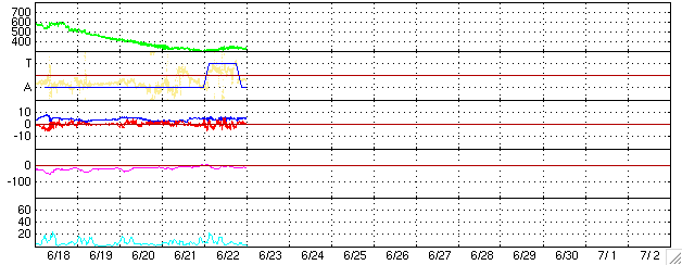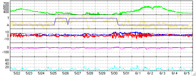 ACEが観測した太陽風の磁場(1番上の枠、白線は全体の強度、赤線は南北成分) および、太陽風の密度(3番目の橙線)、速度(4番目の黄線) (c) NOAA/SEC ![]() リアルタイムAE指数 下段のAEグラフの値が高くなると、オーロラ活動が活発化しています。 (c) 京都大学, NICT ![]() 27日の太陽周期に合わせたデータプロット (太陽風版) 太陽が同じ面を地球に向けていた27日前の変化から、今後を予想することができます。 (c) NICT