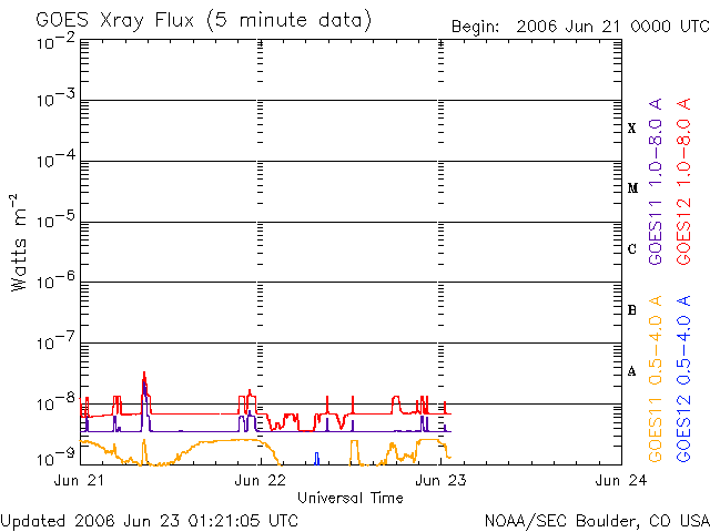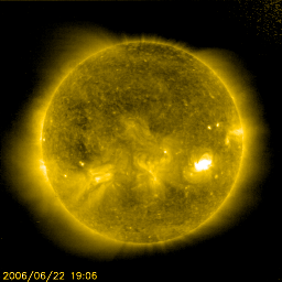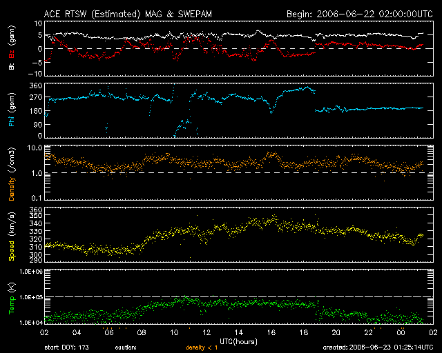2006/ 6/23 10:23 更新 太陽風は低速で、磁気圏も穏やかです。太陽は無黒点になっています。 担当 篠原 前周期の5月31日から、コロナホールによる高速の太陽風がやって来ました。 これは、今周期では6月27日にあたります。 その発生原因となるコロナホールの姿が見えて来ている頃です。 そこで、SOHO EIT284の最新(6月22日、左)の写真と、27日前(5月26日、右)の写真を比較します。 右の前周期の写真では、太陽の中心やや上から、東(左)方向にかけて、 暗いコロナホールが延びているのが見えます。 特に、東よりの、赤道に近いコロナホールが、 地球へやってきた高速風の主な発生源だったと考えられます。 これと比較して、左の最新の写真では、コロナホールが淡くなって、 全体的に見えにくくなっているのが分かります(同じ場所に影は見えています)。 この様子では、今回はコロナホールの影響が弱まっているのではないでしょうか。 まだ、高速風は残っているでしょうが、最高速の高さや、継続期間など、 前回よりも規模が縮小している可能性があります。 答えが見えてくるのは4日後以降になりますが、 この写真の変化を考慮しつつ今後の太陽風の変化を見ていくと面白いでしょう。 さて、現在の状況ですが、太陽風は300〜340km/秒の速度で、低速のままです。 磁場強度は5nTと普通の状態です。 南北成分は、-2nTくらいの弱い南向きが数時間続く変化が見えています。 これに対応するように、AE指数では小さな変化が見えています。 この様な低速風の時は、オーロラの活動領域が高緯度側に移動します。 したがって、AE観測点よりも高緯度側に行くと、 もう少し大きなオーロラ活動が見えていたかもしれません。 もちろん、その場合でも小規模の活動です。 上に書きましたが、次の高速風が来るのは27日頃になるでしょう。 それまでは、現在の穏やかな状態が続くでしょう。 太陽のフレア活動もとても穏やかです。 X線のグラフは観測の最低レベルに落ちている様です。 黒点も、896の番号はありますが、実際には黒点は消えていて、 太陽は無黒点になっているそうです。 SOHO衛星のEIT284カメラの映像 (c) SOHO (ESA & NASA)