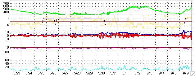 ACEが観測した太陽風の磁場(1番上の枠、白線は全体の強度、赤線は南北成分) および、太陽風の密度(3番目の橙線)、速度(4番目の黄線) (c) NOAA/SEC ![]() リアルタイムAE指数 下段のAEグラフの値が高くなると、オーロラ活動が活発化しています。 (c) 京都大学, NICT ![]() 27日の太陽周期に合わせたデータプロット (太陽風版) 太陽が同じ面を地球に向けていた27日前の変化から、今後を予想することができます。 (c) NICT