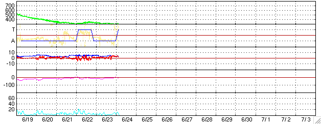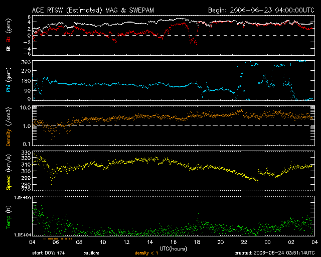 2006/ 6/24 12:52 更新 太陽風は低速で安定しています(300km/秒)。磁気圏も静穏です。 担当 篠原 穏やかな宇宙天気が続いています。 太陽風は速度が300km/秒前後と低速で安定しています。 磁場強度は4nT。 南北成分は北より傾向から、図の後半はほぼ北向きの状態になっています。 磁気圏へのエネルギー供給は小さくなっており、磁気圏活動もおだやかです。 オーロラの活動度を示すAE指数には全く変化が見られません。 このまま、太陽風、磁気圏ともに穏やかな状態が続くでしょう。 SOHO EIT284の太陽画像は、昨日よりも回転していますので、 コロナホールはより見やすい位置に来ています。 それでも、コロナの明るいガスに囲まれ、コロナホールは淡くしか見えません。 前回よりも勢力がだいぶ落ちた様です。 27日以降に予想される高速太陽風は、今周期は規模が弱まっているのではないでしょうか。 太陽は無黒点が続いています。 X線のグラフはわずかに増加していますが、 これはEIT284で東端(左端)に明るく見えている活動領域が上がってきたからでしょう。 今のところ、特に活動的という見え方はしてません。 太陽も静穏な状態が続きそうです。 SOHO衛星のEIT284カメラの映像 (c) SOHO (ESA & NASA)