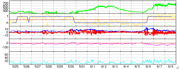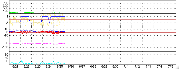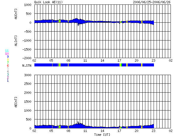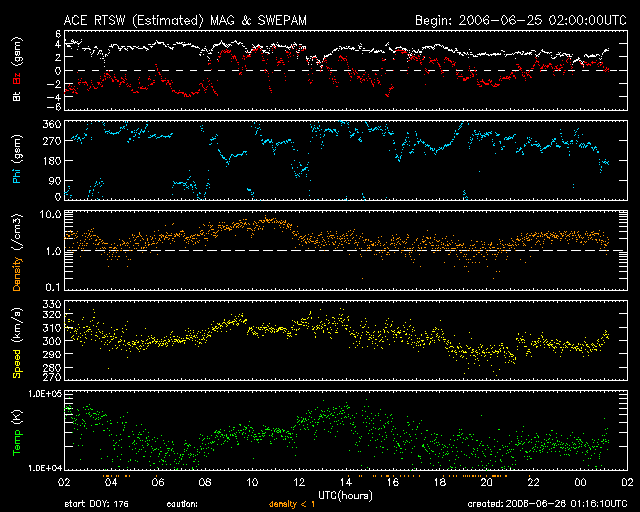 2006/ 6/26 10:17 更新 太陽風は低速で(300km/秒)、磁気圏は静穏です。明日以降、高速風が来る可能性があります。 担当 篠原 太陽風は、低速で穏やかな状態が続いています。 速度は300km/秒で安定し、磁場強度は4nTから2nTへ弱まってます。 南北成分は、南向きの-4nTがしばらく続いたりした時間帯も見られますが、 速度がとても遅いため、磁気圏への影響は小さなものとなっています。 AE指数は小さな変化が見える程度です。 今日いっぱいは現在の穏やかな状態が続くと思われます。 明日以降、コロナホールの影響が現れ始めると予想されます。 SOHOの写真が更新されていませんので、GOES衛星のX線写真を掲載します。 太陽の中心北寄りに暗い部分があり、ここにコロナホールがあります。 一昨日のSOHOの写真で見た印象では、規模は前周期より小さくなっています。 27日周期の図では、明日、27日くらいから太陽風の速度に変化が始まりそうですが、 太陽写真のコロナホールの位置から見積もると、一日遅れて、28日くらいになるかもしれません。 前回の高速風は最高600km/秒の規模でした。 速度上昇の前には、太陽風の磁場強度が強まる変化が見られます。 今後の太陽風の変化に注目してください。 太陽では、東の端から新しい黒点群が上がって来ました。 規模は小さいようです。 X線の動画ではとても小さな活動を起こしています。 今後、小規模フレアを起こすかもしれないとのことです。 基本的には、太陽のフレア活動は穏やかなまま推移しそうです。 GOES衛星のX線カメラで撮影した太陽の様子。コロナホールを見るために強調処理をしている。26日10時 (世界時26日01時)。 (c) NOAA/SEC ![]() ACEが観測した太陽風の磁場(1番上の枠、白線は全体の強度、赤線は南北成分) および、太陽風の密度(3番目の橙線)、速度(4番目の黄線) (c) NOAA/SEC ![]() リアルタイムAE指数 下段のAEグラフの値が高くなると、オーロラ活動が活発化しています。 (c) 京都大学, NICT ![]() 27日の太陽周期に合わせたデータプロット (太陽風版) 太陽が同じ面を地球に向けていた27日前の変化から、今後を予想することができます。 (c) NICT