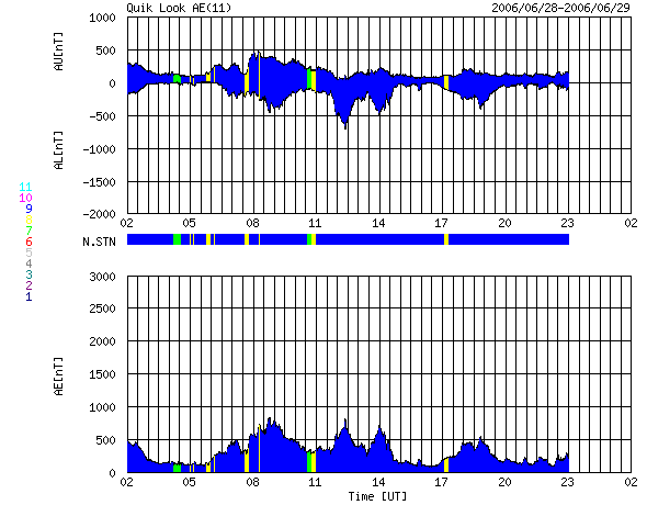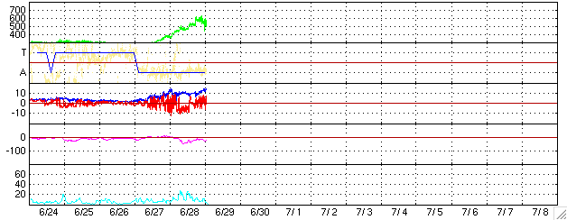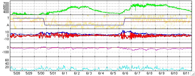 ACEが観測した太陽風の磁場(1番上の枠、白線は全体の強度、赤線は南北成分) および、太陽風の密度(3番目の橙線)、速度(4番目の黄線) (c) NOAA/SEC ![]() リアルタイムAE指数 下段のAEグラフの値が高くなると、オーロラ活動が活発化しています。 (c) 京都大学, NICT ![]() 27日の太陽周期に合わせたデータプロット (太陽風版) 太陽が同じ面を地球に向けていた27日前の変化から、今後を予想することができます。 (c) NICT