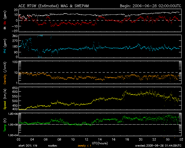 2006/ 6/29 10:43 更新 太陽風が高速になっています(550〜600km/秒)。磁場強度は強まったままです(15nT)。 担当 篠原 地球は高速太陽風の領域に入っています。 昨日より、太陽風の速度は上昇を続け、29日3時(世界時28日18時)に600km/秒に達しました。 その後は、550〜600km/秒で推移しています。 最新の部分では、550km/秒を切る方向に変化していて、既に最高速に達してしまったかの様です。 その一方、太陽風磁場の強度は強まったままです。 昨日より10nTと普段の2倍くらいに強まった状態が続き、 最新の部分では更に15nTへ向かって増加する気配があります。 この様子では、これからもう一段、太陽風速度の上昇が起こるかもしれません。 27日周期の図で前周期の変化を見ると、最高速に達したのは6月2日のことで、 これは今周期では今日、29日に相当します。 ただ、SOHOに見えていたコロナホールの規模がそれほど大きくなかったということや、 600km/秒という速度は、コロナホールの高速風としては既に十分上昇した値ですので、 これから更に大きく速度が上がるとは考えにくい面もあります。 太陽風がこれからどのように変化して行くか、注目されます。 太陽風磁場の南北成分は、28日16時(世界時28日7時)から-5nTの南向きが7時間ほど続きました。 この影響で、AE指数で800nT規模の変動が発生しています。 その後は、0nT付近からやや北寄りに推移していて、磁気圏はあまり乱れていません。 現在、速度が高まっていることと、磁場強度が15nT近くとかなり強まっていることから、 南北成分が南寄りに変わった場合、磁気圏が大きく乱れる可能性があります。 磁場強度が下がるまでは、太陽風磁場の変化に注意する必要があります。 太陽写真には、2つの黒点群が見えています。 右が897黒点群、左の新しく上がって来たものが898黒点群です。 897群は磁場構造が複雑になったとお知らせしましたが、目立った活動は起こしていません。 898黒点群もBクラスのとても小さな変動を起こしましたが、活発という見え方はしていません。 太陽のフレア活動は穏やかに推移するでしょう。 SOHO衛星のEIT284カメラの映像 (c) SOHO (ESA & NASA)