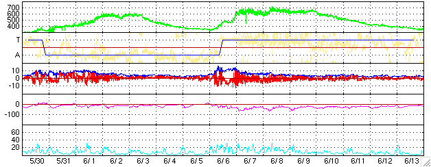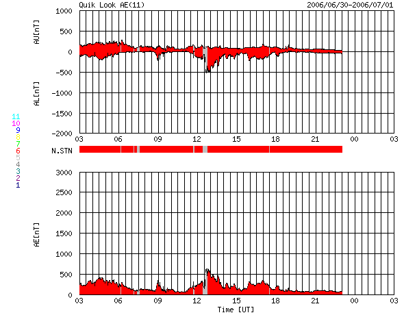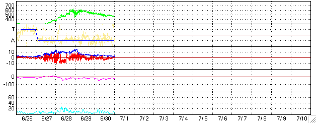 ACEが観測した太陽風の磁場(1番上の枠、白線は全体の強度、赤線は南北成分) および、太陽風の密度(3番目の橙線)、速度(4番目の黄線) (c) NOAA/SEC ![]() リアルタイムAE指数 下段のAEグラフの値が高くなると、オーロラ活動が活発化しています。 (c) 京都大学, NICT ![]() 27日の太陽周期に合わせたデータプロット (太陽風版) 太陽が同じ面を地球に向けていた27日前の変化から、今後を予想することができます。 (c) NICT