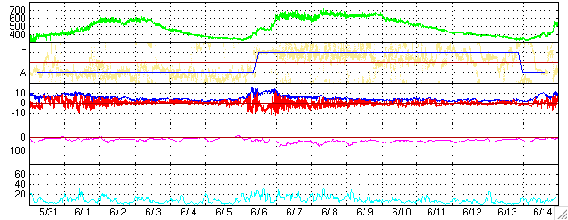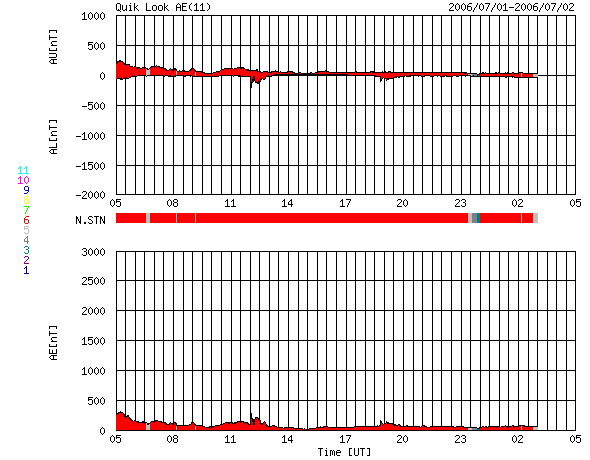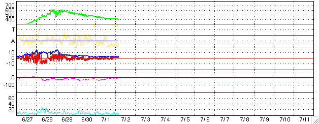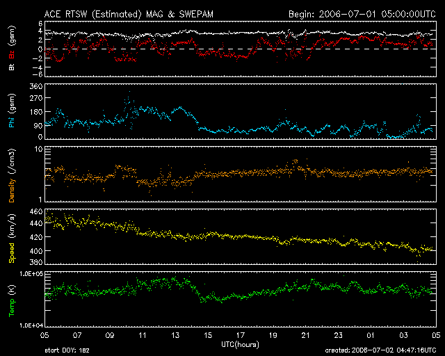 2006/ 7/ 2 13:49 更新 太陽風の速度は低下を続け、400km/秒に戻っています。磁気圏は穏やかです。 担当 篠原 太陽風は順調に速度を下げ続け、450km/秒から400km/秒になりました。 通常の速度です。 磁場強度は3nTのままほとんど変化はなく、太陽風は穏やかになっています。 太陽風磁場の南北成分も小さな振幅になっており、 南を向く時間帯はありますが、せいぜい-2nT程度です。 速度が下がっていることもあり、磁気圏への影響はとても小さく、 オーロラ活動を示すAE指数を見ても、ほとんど変化は観測されていません。 SOHOのホームページの写真が更新されていませんので、GOESのX線写真を強調処理して掲載します。 太陽の中心に南北に伸びるコロナホールが見えています。 しっかりとしたコロナホールの様で、高速風もしっかりと吹き出していそうです。 今日の写真で太陽の中心に達していますので、 これから計算すると3日後の5日頃から地球へ影響が及びそうです。 しかし、27日周期の図で前周期の変化を参考にすると、明日、3日から影響が現れ始める可能性もあります。 写真を見た印象では、コロナホールの分布が細くなっている様子なので、 前周期とは太陽風速度の変化の様子が変わっているのではないでしょうか。 速度の上昇に先立って、太陽風磁場が強まる変化が起こります。 磁場が強まって、速度が上昇を始めると、磁気圏が乱れて、 オーロラが活発になったり、弱い磁気嵐になることがあります。 これから太陽風の変化に注目してください。 放射線帯の高エネルギー電子は、警戒ラインより一桁下の、 10の3乗に届かないレベルでとどまっています。 これ以上の大きな増加はないでしょう。 太陽では、898黒点群がB9.8という、Cクラスにわずかに達しませんでしたが、 小規模のフレアを起こしています。 特に発達をしたということはありませんが、今後も小規模のフレアを起こす可能性がある様です。 また、このB9.8のフレアに伴って、小規模のCME(太陽ガスの放出現象)が起こっているかもしれません。 SOHOの写真が更新されれば、詳細が分かるでしょう。 GOES衛星のX線カメラで撮影した太陽の様子。コロナホールを見るために強調処理をしている。2日13時 (世界時2日04時)。 (c) NOAA/SEC ![]() ACEが観測した太陽風の磁場(1番上の枠、白線は全体の強度、赤線は南北成分) および、太陽風の密度(3番目の橙線)、速度(4番目の黄線) (c) NOAA/SEC ![]() リアルタイムAE指数 下段のAEグラフの値が高くなると、オーロラ活動が活発化しています。 (c) 京都大学, NICT ![]() 27日の太陽周期に合わせたデータプロット (太陽風版) 太陽が同じ面を地球に向けていた27日前の変化から、今後を予想することができます。 (c) NICT