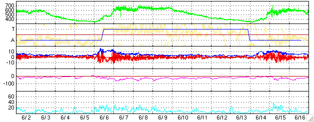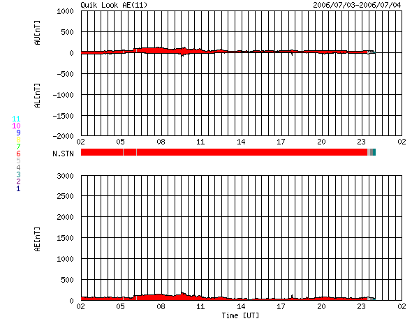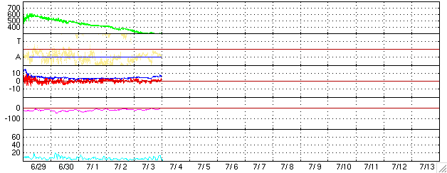 ACEが観測した太陽風の磁場(1番上の枠、白線は全体の強度、赤線は南北成分) および、太陽風の密度(3番目の橙線)、速度(4番目の黄線) (c) NOAA/SEC ![]() リアルタイムAE指数 下段のAEグラフの値が高くなると、オーロラ活動が活発化しています。 (c) 京都大学, NICT ![]() 27日の太陽周期に合わせたデータプロット (太陽風版) 太陽が同じ面を地球に向けていた27日前の変化から、今後を予想することができます。 (c) NICT