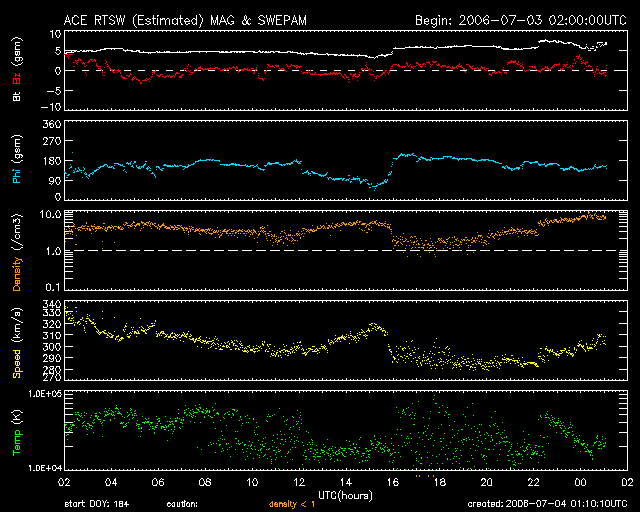 2006/ 7/ 4 10:12 更新 太陽風の速度は遅く(300km/秒)、磁気圏は静穏です。これから高速風が始まります。 担当 篠原 穏やかな太陽風が続いています。 昨日より、太陽風の速度に大きな変化なく、300km/秒を前後していてかなり低速です。 太陽風磁場の強度は5nTでほぼ安定。 南北成分は0nT付近にとどまっていて、磁気圏への影響はとても小さくなっています。 AE指数にはほとんど変化は無く、オーロラなどの磁気圏活動はかなり低レベルです。 SOHO EIT284の太陽写真を見ると、 南北に伸びたコロナホールが中心線を越えて西側へと進んでいます。 地球へ高速風が届き始める目安の位置、「太陽の中心と西端の中間点」に達しつつあります。 これから地球は高速風領域に入ることになるでしょう。 速度上昇に先立って、太陽風磁場の強度が上昇する変化がみられます。 27日周期の図を見てください。 前回は、6月6日に速度(緑色線)の上昇が始まり、7日に最高速に達しています。 一方、磁場強度(青線)は6日に速度が上がり始めるところですぐに最高値に達し、 最高速に達した7日には既に弱まり始めています。 同様の変化が今回も見られると思います。 磁場が強まると、南向きも強まる可能性が高まり、磁気圏活動は強まりやすくなります。 そこで速度が上がると、磁気圏へのエネルギーの流入量が高まり、オーロラの活動が活発になります。 写真に見えるコロナホールの位置では、高速風の始まりは明日になるかもしれません。 これからの太陽風の変化に注目してください。 太陽では、898黒点群がC1の小さな小規模フレアを起こしています。 この3日ほど、1日1フレアのペースになっています。 黒点群の規模に変化はなく、今後も同程度の活動を行う程度でしょう。 太陽活動は概ね静穏な状態が続きます。 SOHO衛星のEIT284カメラの映像 (c) SOHO (ESA & NASA)