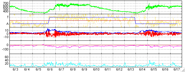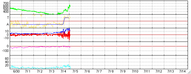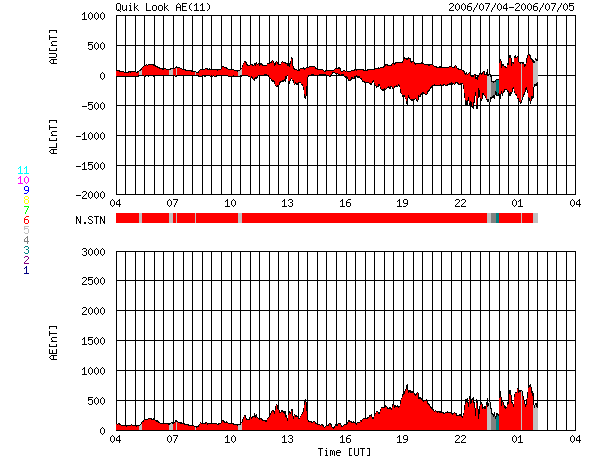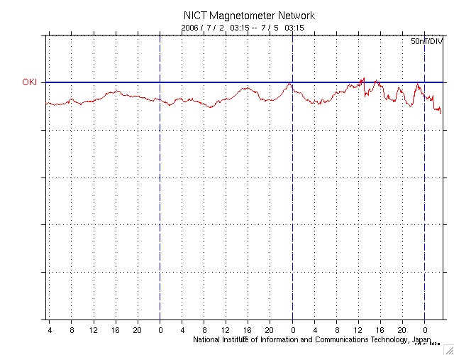 ACEが観測した太陽風の磁場(1番上の枠、白線は全体の強度、赤線は南北成分) および、太陽風の密度(3番目の橙線)、速度(4番目の黄線) (c) NOAA/SEC ![]() リアルタイムAE指数 下段のAEグラフの値が高くなると、オーロラ活動が活発化しています。 (c) 京都大学, NICT ![]() 沖縄の磁場擾乱 下へ下がるほど、擾乱が発達している事を意味します。 (c) NICT ![]() 27日の太陽周期に合わせたデータプロット (太陽風版) 太陽が同じ面を地球に向けていた27日前の変化から、今後を予想することができます。 (c) NICT