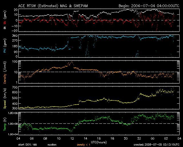 2006/ 7/ 5 12:15 更新 コロナホールによる高速風が始まりました(600km/秒)。オーロラの活動も活発化しています。 担当 篠原 高速太陽風が始まりました。 昨日のニュース以降、太陽風磁場が強まり始めました。 磁場強度は、5nTから5日0時(世界時4日15時)頃に10nTを越え、 5日5時(世界時4日20時)には20nTまで強まりました。 現在はやや下がって10nTに戻っています。 磁場の変化に続くように、太陽風の速度もゆっくりと上昇を始めました。 昨日のニュースの頃は300km/秒でしたが、 ほぼ1日経った5日10時(世界時5日1時)に、600km/秒へ達しました。 速度が600km/秒に達した頃に、磁場強度は20nTから10nTへ下がる変化をしています。 このことから、この高速風領域の最高速に達しつつあると考えられます。 27日周期の図を見ると、太陽風の変化は前周期から1日ほど遅れています。 前回の高速風は、600km/秒台が3日続き、その後2日かけて速度が下がっています。 今回も同じ様な変化が続くのではないでしょうか。 SOHO EIT284の写真では、高速風の発生源であるコロナホールが、 右側半分のところに見えています。 コロナホールの規模がやや狭まった印象があるので、高速風の期間も少し短くなるかもしれません。 太陽風磁場の南北成分は、 ACEの図の前半では、比較的0nT付近にとどまっています。 後半に入ると、大きく南北へ振れるようになっています。 これに対応するように、オーロラ活動のAE指数も、 前半は比較的おとなしく、後半で活発な変化を示しています。 ただ、規模としては700nT前後の変化にとどまっていて、激しいものではありません。 現在、太陽風の速度はとても高まっています。 太陽風磁場の南向きによって、磁気圏活動が活発になりやすい状態です。 磁場強度が弱まるまでは、活発な活動が続く可能性があります。 太陽では、898黒点群が小規模フレアを起こして、やや活動的な状態を保っています。 今朝、5日4時(世界時4日19時)にも、C1の小さな小規模フレアを起こしています。 898黒点群が起こし続けている小規模のフレアですが、 どれも長時間型のフレアになっていて、X線の動画を見ると、 小さいながらも雄大な感じがします。 小規模のCME(太陽ガスの放出現象)を伴っているかもしれませんが、 SOHOの写真が整っておらず、よく分かりません。 SOHO衛星のEIT284カメラの映像 (c) SOHO (ESA & NASA)