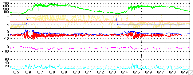GOES衛星の太陽X線データ (c) NOAA/SEC ![]() SOHO衛星のMDIカメラによる太陽黒点 (c) SOHO (ESA & NASA) ![]() ACEが観測した太陽風の磁場(1番上の枠、白線は全体の強度、赤線は南北成分) および、太陽風の密度(3番目の橙線)、速度(4番目の黄線) (c) NOAA/SEC ![]() リアルタイムAE指数 下段のAEグラフの値が高くなると、オーロラ活動が活発化しています。 (c) 京都大学, NICT ![]() 沖縄の磁場擾乱 下へ下がるほど、擾乱が発達している事を意味します。 (c) NICT ![]() 27日の太陽周期に合わせたデータプロット (太陽風版) 太陽が同じ面を地球に向けていた27日前の変化から、今後を予想することができます。 (c) NICT