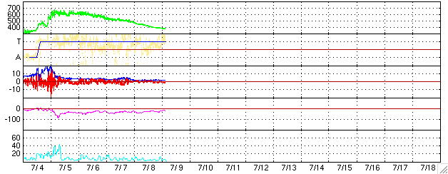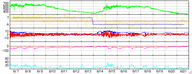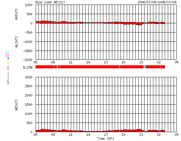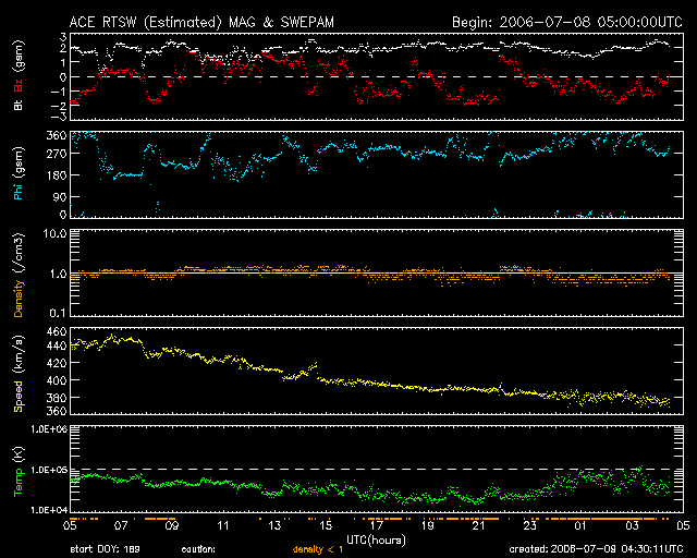 2006/ 7/ 9 13:33 更新 太陽風は通常の速度(380km/秒)で、磁気圏は静穏です。これからCMEの影響が見られるかもしれません。 担当 篠原 太陽風の速度は380km/秒まで下がりました。 通常の速度にもどっています。 磁場強度も2nTと弱まったままで、穏やかな太陽風になっています。 ACEの図では、南北成分が大きく振動しているように見えますが、 振幅は小さく、+1nTと-2nTの間を揺れている程度です。 このため、磁気圏はとても穏やかになっています。 AE指数にはほとんど変化がありません。 これから、6日17時(世界時6日8時)の中規模フレアに伴って発生した、 CME(太陽ガスの放出現象)による太陽風の乱れが地球に到来する可能性があります。 CMEのガスは太陽から南西に飛び出していますので、 地球へはガスのかたまりの端の方が当たることになると考えられます。 フレアが中規模だったことや、発生から既に2日半以上経っていることなどから、 速度が大きく上昇することはないでしょう。 速度が乱れ、太陽風磁場の南向き成分が強まると、 オーロラ活動が活発になったり、弱い磁気嵐が発生する可能性があります。 この乱れは1日程度で収まると思われます。 続いて、11日、もしくは12日から、コロナホールによる高速風がやってきます。 27日周期の図で、前周期の6月14日から始まっている高速風です。 この発生源であるコロナホールが、太陽の中心からやや南に寄ったところに見えています。 前回の高速風では、600km/秒の速度が4日ほど続きました。 今回も同程度の乱れになるのではないでしょうか。 放射線帯の高エネルギー電子はやや減少して、 警戒ラインの10の4乗を割りました。 引き続きゆっくりと減少が続くでしょう。 ここしばらく活発に活動していた898黒点群ですが、次第に活動度を弱めています。 この24時間は目立ったフレア活動を起こしていません。 黒点群としての規模は保っていますので、引き続き注目する必要はあります。 一方、太陽の西端に近づいているので、やがて没して見えなくなります。 SOHO衛星のEIT284カメラの映像。7月9日10時(世界時7月9日1時)。 (c) ESA & NASA ![]() ACEが観測した太陽風の磁場(1番上の枠、白線は全体の強度、赤線は南北成分) および、太陽風の密度(3番目の橙線)、速度(4番目の黄線) (c) NOAA/SEC ![]() リアルタイムAE指数 下段のAEグラフの値が高くなると、オーロラ活動が活発化しています。 (c) 京都大学, NICT ![]() 27日の太陽周期に合わせたデータプロット (太陽風版) 太陽が同じ面を地球に向けていた27日前の変化から、今後を予想することができます。 (c) NICT