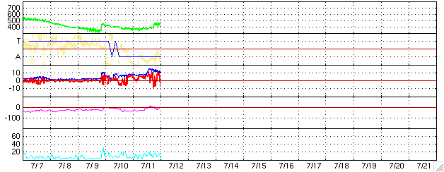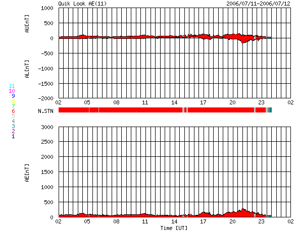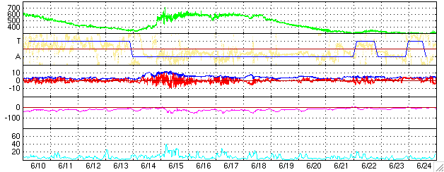 ACEが観測した太陽風の磁場(1番上の枠、白線は全体の強度、赤線は南北成分) および、太陽風の密度(3番目の橙線)、速度(4番目の黄線) (c) NOAA/SEC ![]() リアルタイムAE指数 下段のAEグラフの値が高くなると、オーロラ活動が活発化しています。 (c) 京都大学, NICT ![]() 27日の太陽周期に合わせたデータプロット (太陽風版) 太陽が同じ面を地球に向けていた27日前の変化から、今後を予想することができます。 (c) NICT