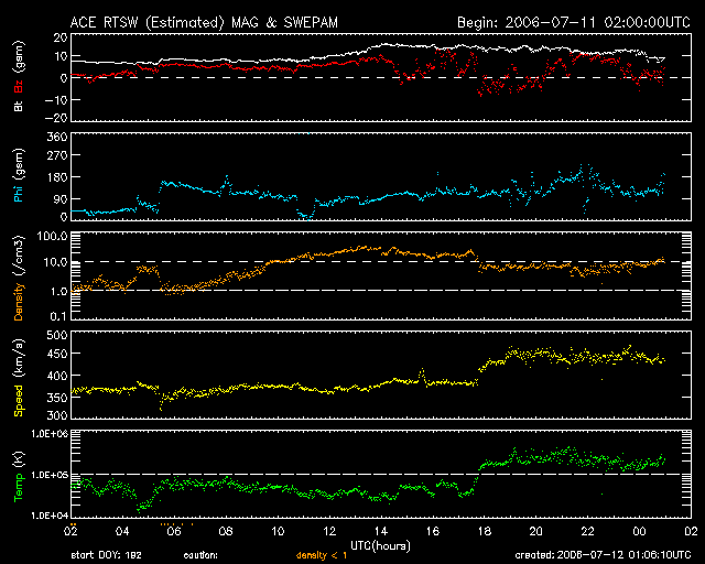 2006/ 7/12 10:06 更新 太陽風の磁場が強まっています(10nT)。速度は450km/秒に上昇していますが、更に上昇すると予想されます。 担当 篠原 昨日のニュースの頃に7nTに強まっていた太陽風の磁場強度は、 その後更に上昇して、11日23時(世界時11日14時)頃に15nTに達しました。 コロナホールによる速度上昇の前触れと思われる変化だったのですが、 太陽風の速度に大きな変化は起こっておらず、 12日3時(世界時11日18時)に、380km/秒から450km/秒へ小幅の上昇が発生した程度です。 15nTにまで強まった磁場強度は、むしろ弱まり始め、現在は10nTに下がっています。 ちょっと肩すかしの様な変化になってしまっていますが、 これから本格的な速度上昇が始まるのではないかと思います。 27日周期の周期で対応させると、太陽風の速度は今日からの上昇が予想されます。 そして、磁場強度の強まりが早くなっていたのは、CMEの影響が残っていたからだとも考えられます。 このまま磁場強度の高い状態が続くか、弱まってしまうかで今後の展開が変わるでしょう。 磁場強度が5nT程度へ下がってしまうようだと、高速風は空振りになると思います。 太陽風磁場の南北成分は、ここまでは北寄りで推移しています。 そのため、磁気圏活動への影響もほとんど見られない状態です。 今後、この傾向が南寄りに切り替わるなどすると、 速度がやや上がっていることと合わさって、磁気圏の活動は活発になるでしょう。 太陽では中心付近に899黒点群がとても小さく見えています。 写真がにじんでいるだけのような見え方で、やがて消えてしまいそうです。 その他に黒点群はなく、太陽の活動はとても穏やかです。 SOHO衛星のEIT284カメラの映像 (c) SOHO (ESA & NASA)
