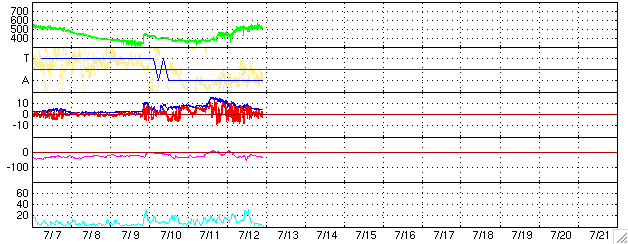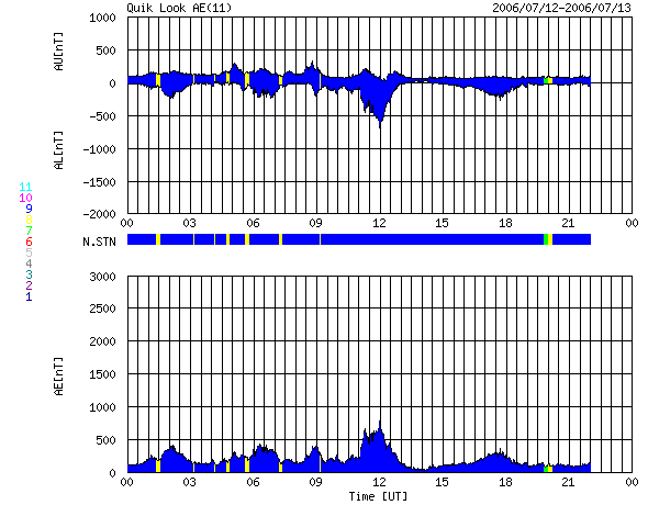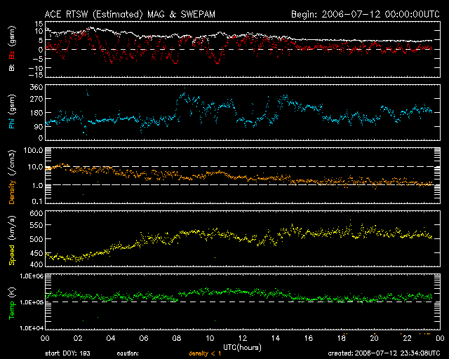 2006/ 7/13 08:37 更新 太陽風は、500〜550km/秒の高速風になっています。小規模のオーロラ活動が見られています。 担当 篠原 太陽風の速度が上昇しています。 12日15時(世界時12日6時)頃に500km/秒を越え、 その後、500〜550km/秒の高速状態が続いています。 SOHO EIT284の太陽写真では見えなくなってしまいましたが、 コロナホールの影響によるものです。 速度が上昇するとともに太陽風の磁場強度は低下して、5nTに下がりました。 高速風は最高速度の領域に入っていると思われます。 太陽風磁場の南北成分は、ACEの図の前半では南北によく振れています。 一方、後半は0付近で変化しています。 このため、AE指数では前半を中心に変動が見られています。 しかし、最高が600nTで、その他は300nT前後と概ね小規模の活動に留まっています。 まだ速度がそれほど高まっていなかったためでしょう。 後半では活動はより小さくなっています。 磁場強度が弱まっているので、今後も小規模の活動に留まるのではないでしょうか。 27日周期の図で前周期の変化と比較すると、 前回は速度が600km/秒近くまで上がっていたのに対し、 今回は50km/秒程度遅くなっています。 コロナホールの規模は弱まっている様です。 従って、前回は4日ほど高速風が続きましたが、 今回の高速風継続期間は短くなるかもしれません。 SOHO EIT284では、太陽面はぼんやりと光っていて、コロナホールは見えません。 現在の高速風が過ぎると、しばらくは穏やかな状態が続くでしょう。 太陽黒点の写真は、899の番号は残っていますが、 この写真では黒点の姿を見つける事ができません。 899黒点群はかなり小さくなってしまった様です。 X線グラフの強度も最低レベルに下がっていて、太陽の活動はとても穏やかです。 SOHO衛星のEIT284カメラの映像 (c) SOHO (ESA & NASA)