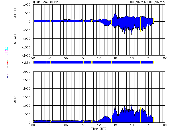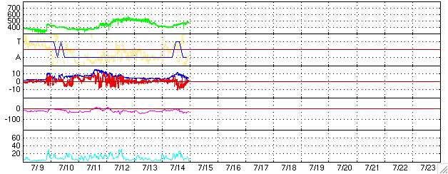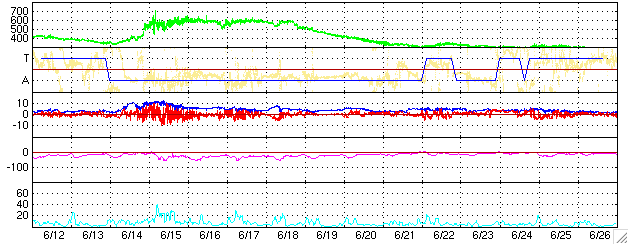 ACEが観測した太陽風の磁場(1番上の枠、白線は全体の強度、赤線は南北成分) および、太陽風の密度(3番目の橙線)、速度(4番目の黄線) (c) NOAA/SEC ![]() リアルタイムAE指数 下段のAEグラフの値が高くなると、オーロラ活動が活発化しています。 (c) 京都大学, NICT ![]() 沖縄の磁場擾乱 下へ下がるほど、擾乱が発達している事を意味します。 (c) NICT ![]() 27日の太陽周期に合わせたデータプロット (太陽風版) 太陽が同じ面を地球に向けていた27日前の変化から、今後を予想することができます。 (c) NICT