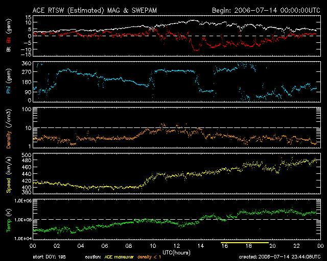2006/ 7/15 08:47 更新 太陽風に乱れが発生しています(速度480km/秒)。南向き磁場の影響で、磁気圏でも乱れが発生しています。 担当 篠原 静穏に戻った太陽風に、一時的な乱れが発生しています。 高速風領域を通過して、速度400km/秒、磁場強度3nTと、穏やかになっていた太陽風ですが、 14日14時(世界時14日5時)頃から磁場強度がゆっくりと強まり、 14日22時(世界時14日13時)頃に10nTへ、 14日18時(世界時14日9時)頃からは、速度も上がって、現在480km/秒に達しています。 やや高速という程度ですが、突然の高速風になりました。 10nTに強まった後、磁場強度は低下に転じて、既に5nTに弱まっています。 したがって、速度もこれ以上大きく上がる事はないでしょう。 この太陽風の乱れの原因は、よく分かりません。 SOHO EIT284の太陽写真の西側にはコロナホールの影は見られません。 太陽風磁場のセクター境界の切り替わりがちょうど発生していて、 関連があるのかもしれませんが、セクターの切り替わりがいつも乱れを運ぶ訳ではありません。 前周期の変化でも、コロナホールの規模の割に高速の風が長時間続いた印象がありました。 コロナホールの様な姿で見えてはいませんが、 太陽のこの部分に、高速風を吹き出しやすい構造の様なものがあるのかもしれません。 太陽風の磁場が強まった間、南北成分は大きく南向きに偏っていました。 このため、磁気圏活動が強まっています。 AE指数では、1000nTに達する活発な活動が6時間以上続きました。 沖縄の磁場強度も40nTほど下がっていて、弱い磁気嵐状態になっている様です。 磁場強度は弱まっていますので、今後はそれほどの活動は起こらないでしょう。 今回の太陽風の乱れは一時的なものだと思います。 今日いっぱいくらいで速度も低下に向かうのではないでしょうか。 その後は、穏やかな状態が続くでしょう。 太陽のフレア活動はとても穏やかです。 899黒点群はほとんど見えなくなっています。 一方、東側にとても小さく2つの黒点が見えています。900黒点群という番号が付けられています。 SOHO衛星のEIT284カメラの映像 (c) SOHO (ESA & NASA)