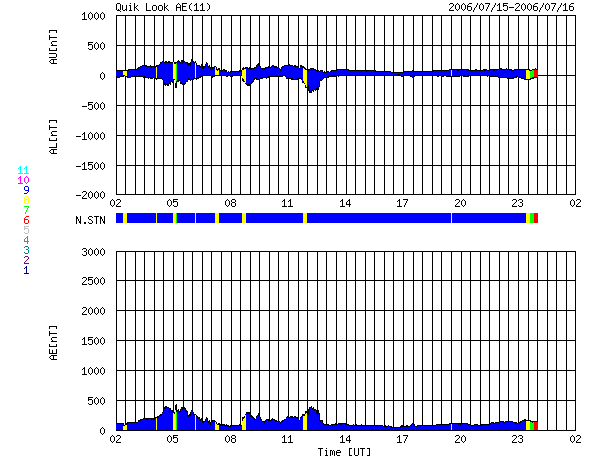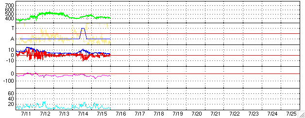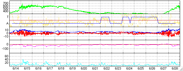ACEが観測した太陽風の磁場(1番上の枠、白線は全体の強度、赤線は南北成分) および、太陽風の密度(3番目の橙線)、速度(4番目の黄線) (c) NOAA/SEC ![]() リアルタイムAE指数 下段のAEグラフの値が高くなると、オーロラ活動が活発化しています。 (c) 京都大学, NICT ![]() 27日の太陽周期に合わせたデータプロット (太陽風版) 太陽が同じ面を地球に向けていた27日前の変化から、今後を予想することができます。 (c) NICT