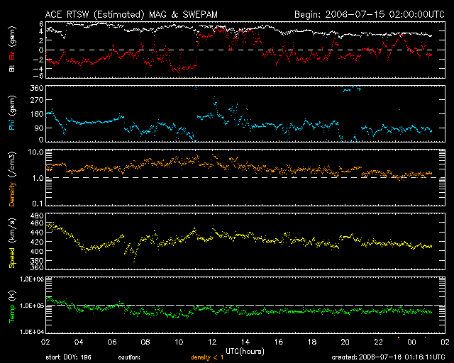 2006/ 7/16 10:19 更新 太陽風の速度は通常の速度に下がっています(400km/秒)。これから8日間ほど穏やかな日が続きそうです。 担当 篠原 急に始まった太陽風の乱れは、短期間かつ小規模で終わりました。 15日9時(世界時15日0時)頃に480km/秒に上がったのが最高で、 その後数時間で420km/秒と通常の速度へ戻っています。 現在は更に下がって、400km/秒です。 速度の乱れに先立って、太陽風磁場の大まかな方向の切り替わりが起こり、 セクター境界を越えたようだとお知らせしましたが、 この変化も一時的なものだったようで、現在は乱れの前の状態にもどっています。 太陽風磁場は、強度が5nTから3nTと弱まっています。 強度としては小さいですが、南寄りの傾向が続いています。 このため、300nT程度の小規模のオーロラ活動が発生しています。 速度が下がった事と南向きも小さいため、この程度の活動になっています。 これから、太陽風は長く静穏な期間が続くと予想されます。 27日周期の図を見てください。 前周期は6月19日に速度が下がり、そのあとはずっと低速が続いています。 図の最後の6月27日に、やっと次の乱れが始まっています。 今周期も同様の経過をたどるとすると、 7月24日まで低速の穏やかな太陽風が続くということになります。 今日を含めて、8日くらい穏やかな状態が続きそうです。 SOHO EIT284の太陽写真はぜんたいがのっぺりとしていて変化がなく、 コロナホールの姿は見えません。 このことからも、当分穏やかな日が続くと予想できます。 太陽のフレア活動もとても穏やかです。 太陽写真で、900黒点群が昨日よりはいくらか見やすくなっています。 とても小さな活動領域で、今のところ目立った活動は起こしていません。 太陽もまた穏やかな状態が続くでしょう。 SOHO衛星のEIT284カメラの映像 (c) SOHO (ESA & NASA)
