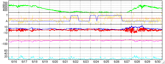 ACEが観測した太陽風の磁場(1番上の枠、白線は全体の強度、赤線は南北成分) および、太陽風の密度(3番目の橙線)、速度(4番目の黄線) (c) NOAA/SEC ![]() リアルタイムAE指数 下段のAEグラフの値が高くなると、オーロラ活動が活発化しています。 (c) 京都大学, NICT ![]() 27日の太陽周期に合わせたデータプロット (太陽風版) 太陽が同じ面を地球に向けていた27日前の変化から、今後を予想することができます。 (c) NICT