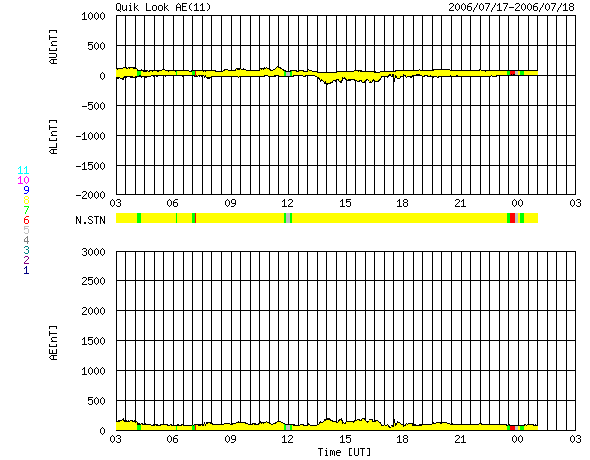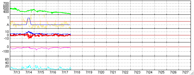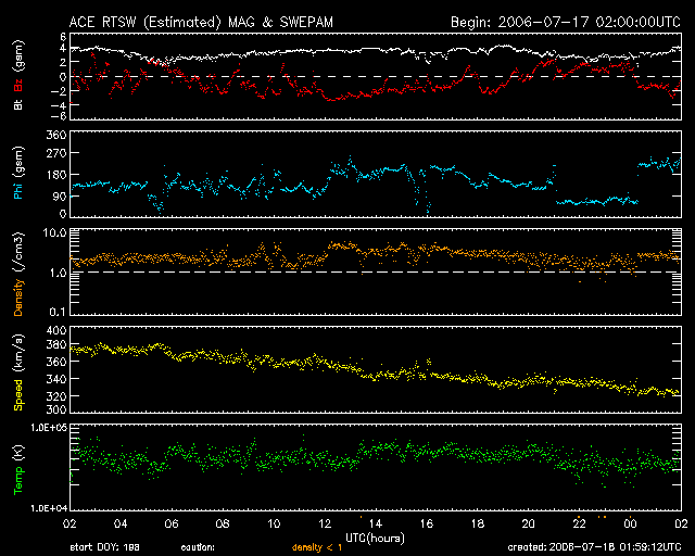 2006/ 7/18 11:02 更新 太陽風の速度は一段と下がり(320km/秒)、磁気圏は静穏です。 担当 篠原 太陽風は更に速度を下げ、320km/秒とかなり低速になっています。 磁場強度も3nTにやや弱まっています。 南北成分はゆったりと変化していて、-2nTの弱い南向きが半日近く続いているところもあります。 しかし、速度が下がりきっているためでしょう、 磁気圏への影響は小さく、AE指数にはほとんど変化が現れていません。 オーロラが活動する緯度は、磁気圏活動の度合いによって変化します。 穏やかな時は、より高緯度側に移動する傾向があります。 そのため、実際にはAE観測点よりも高緯度側でオーロラ活動が発生していて、 AE指数にはその変化が捉えられていないという可能性があります。 ただ、そうだったとしても、小規模のオーロラ活動である事に変わりはないでしょう。 太陽風はこれから1週間程度穏やかな状態が続くと予想されます。 次の乱れは24日頃に始まるでしょう。 太陽の900黒点群は、昨日と規模はあまり変わっていません。 X線のグラフには900黒点群で発生したとても小さな変動が観測されていますが、 いまのところ、900群が活発になったという印象ではありません。 SOHO衛星のEIT284カメラの映像 (c) SOHO (ESA & NASA)