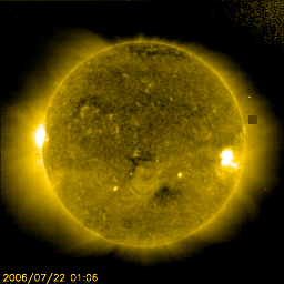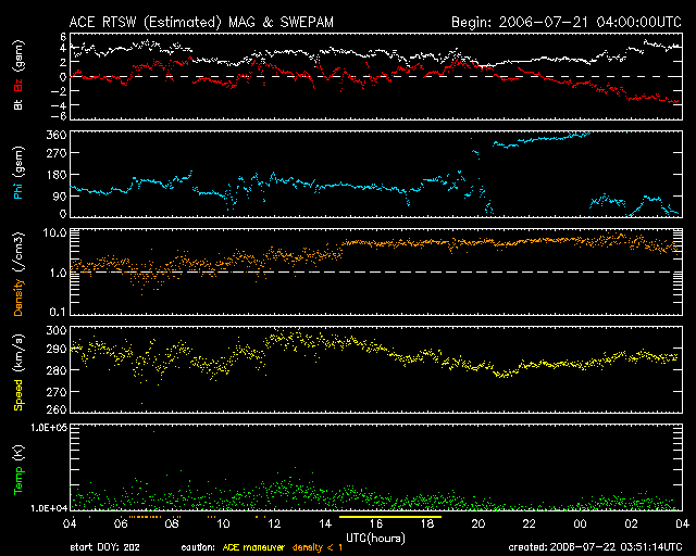 2006/ 7/22 12:52 更新 高速太陽風が近づいてきているようです。 担当 北村 太陽風に変化が現れてきました。 太陽風の速度は依然280km/時くらいで非常に低速な状態が継続していますが、 21日頃より、密度がやや上昇してきています。また、太陽風磁場の大きさも 徐々に強くなっている上に、磁場の南向き成分(赤い線)も強くなっています。 これは、後ろから速い速度の太陽風が遅い太陽風を押し込んでいるときに 見られる変化で、このあとに高速太陽風が到達すると思われます。 SOHO EIT284の画像を見ますと、明るい活動領域900はもうすぐ西の端(向かって 右側)に消えていきそうですが、東の端(向かって左側)から新しい活動領域が 現れ始めているのが分かります。 この影響と思われますが、GOESのX線のグラフを見るとX線の強度が徐々に 強まってきています。ただし、今のところ大きなフレアーなどの発生は確認 されていません。 また、SOHO EIT284の画像で正面やや南側に、黒いコロナホールが確認できます。 ここから噴出している高速太陽風の影響が、上で述べた太陽風の変化として 現れてきているものと考えられます。 AE指数や沖縄磁場擾乱のグラフを見る限りでは、今のとこと地磁気の活動は 静穏な状態を維持しています。しかし、太陽風磁場の南向きの状態が今後強まったり、 長期間継続したりすると地磁気の擾乱も活発になる恐れがありますので注意が 必要です。 SOHO衛星のEIT284カメラの映像 (c) SOHO (ESA & NASA)