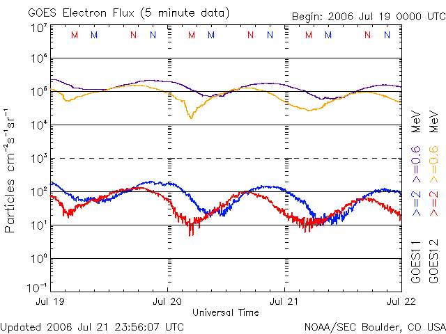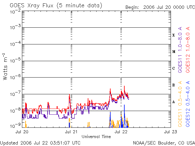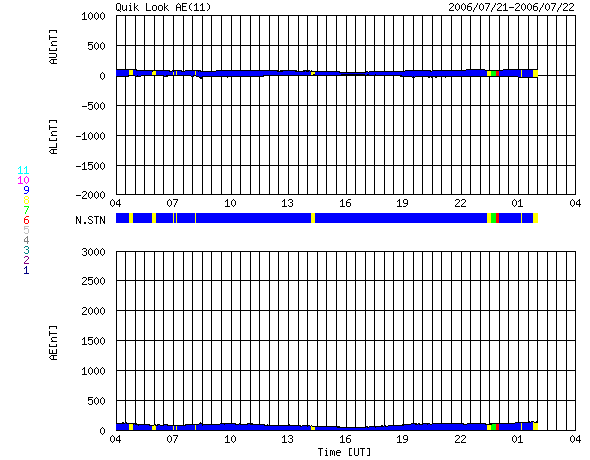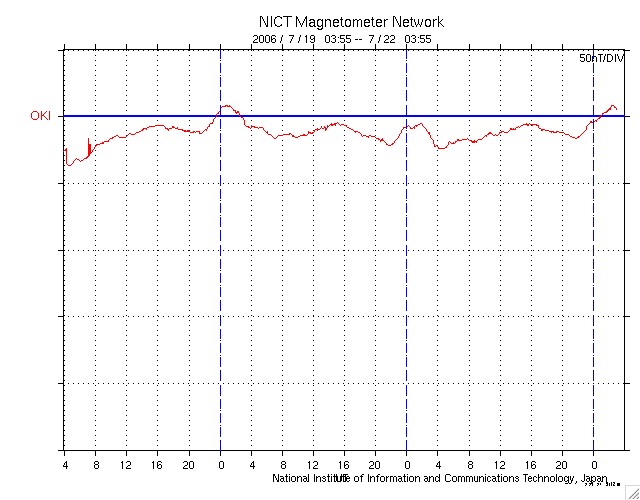 ACEが観測した太陽風の磁場(1番上の枠、白線は全体の強度、赤線は南北成分) および、太陽風の密度(3番目の橙線)、速度(4番目の黄線) (c) NOAA/SEC ![]() GOES衛星の太陽X線データ (c) NOAA/SEC ![]() リアルタイムAE指数 下段のAEグラフの値が高くなると、オーロラ活動が活発化しています。 (c) 京都大学, NICT ![]() 沖縄の磁場擾乱 下へ下がるほど、擾乱が発達している事を意味します。 (c) NICT ![]() GOES衛星による、静止衛星軌道における高エネルギー電子の変化 (c) NOAA/SEC ![]() | ||||||||||||||||||||||||||||||||||||||||