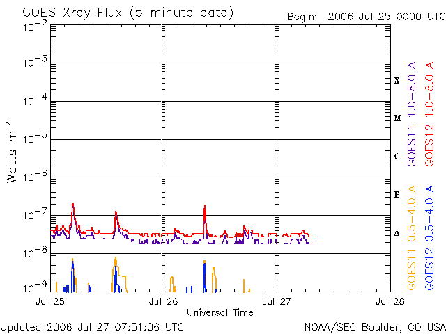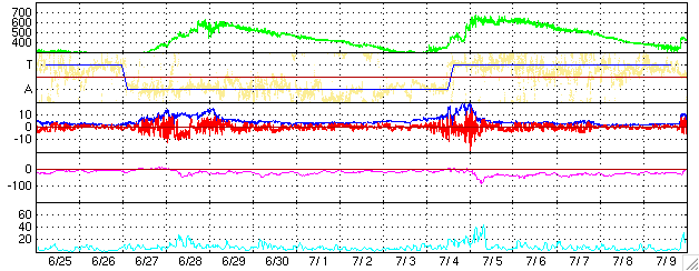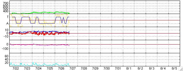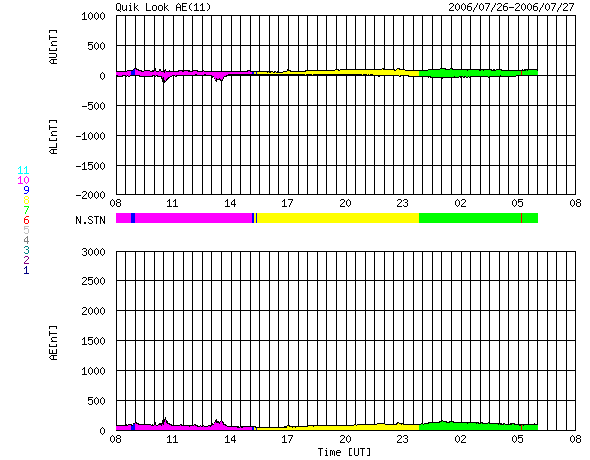 ACEが観測した太陽風の磁場(1番上の枠、白線は全体の強度、赤線は南北成分) および、太陽風の密度(3番目の橙線)、速度(4番目の黄線) (c) NOAA/SEC ![]() GOES衛星の太陽X線データ (c) NOAA/SEC ![]() リアルタイムAE指数 下段のAEグラフの値が高くなると、オーロラ活動が活発化しています。 (c) 京都大学, NICT ![]() シベリアで観測された3日間の磁場データ 右側の3分の1が、昨日のデータになります。グラフが上がったり下がったりすると、オーロラ活動が活発化しています。 (c) NICT ![]() 27日の太陽周期に合わせたデータプロット (太陽風版) 太陽が同じ面を地球に向けていた27日前の変化から、今後を予想することができます。 (c) NICT