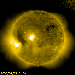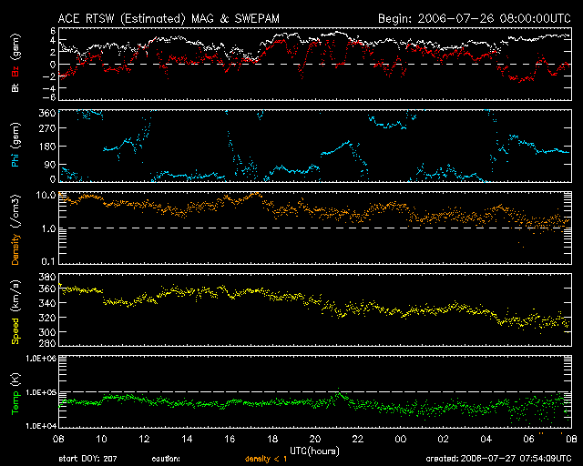 2006/ 7/27 16:55 更新 太陽風速度が減少に転じました。 担当 北村 太陽風速度は再び減速傾向になり、現在320km/秒程度まで下がっています。 太陽風磁場の変動も、26日に入って変動振幅が明らかに小さくなってきており、 太陽風擾乱の領域は抜けたと思われます。結局、今回の太陽風擾乱は、 弱い磁場の変動が見られたのみで、速度は400km/秒を下回る程度でした。 恐らく、急激なコロナホールの縮小によるものと思われます。 SOHO EIT284の画像を見ますと、東側(向かって左)にだいぶ明るい領域が 見えてきましたが、GOESのX線のグラフを見る限りでは、26日に弱いBクラス のフレアが1回発生したのみで、特に活発に活動しているようには見えません。 北側に見えているくらい領域がだいぶ西側(向かって右)に移動してきました。 緯度が若干高いですが、数日中に太陽風の変化が現れそうです。 AE指数やシベリアの磁場変動は非常に静かな状態が継続しており、 オーロラ活動はかなり弱い状態が続いています。 ここ数日は太陽風、磁気圏ともに静穏な状態が続きそうです。 SOHO衛星のEIT284カメラの映像 (c) SOHO (ESA & NASA)