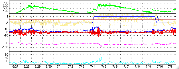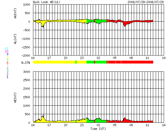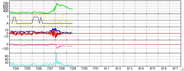 ACEが観測した太陽風の磁場(1番上の枠、白線は全体の強度、赤線は南北成分) および、太陽風の密度(3番目の橙線)、速度(4番目の黄線) (c) NOAA/SEC ![]() 沖縄の磁場擾乱 下へ下がるほど、擾乱が発達している事を意味します。 (c) NICT ![]() リアルタイムAE指数 下段のAEグラフの値が高くなると、オーロラ活動が活発化しています。 (c) 京都大学, NICT ![]() 27日の太陽周期に合わせたデータプロット (太陽風版) 太陽が同じ面を地球に向けていた27日前の変化から、今後を予想することができます。 (c) NICT