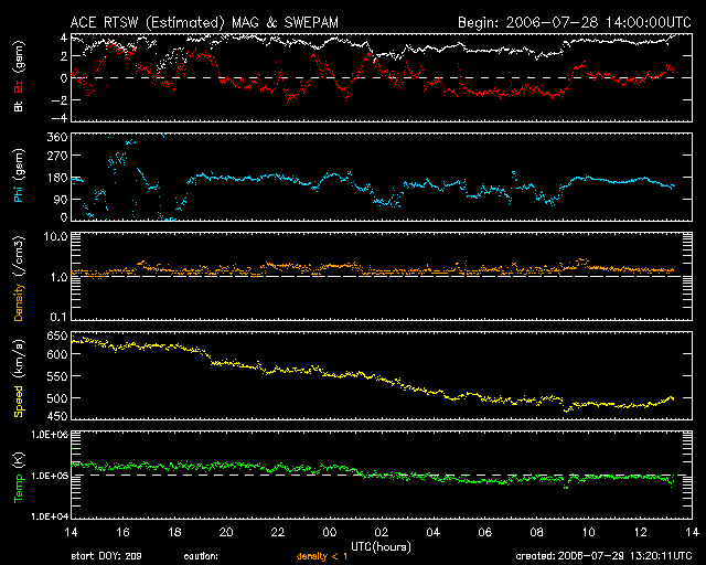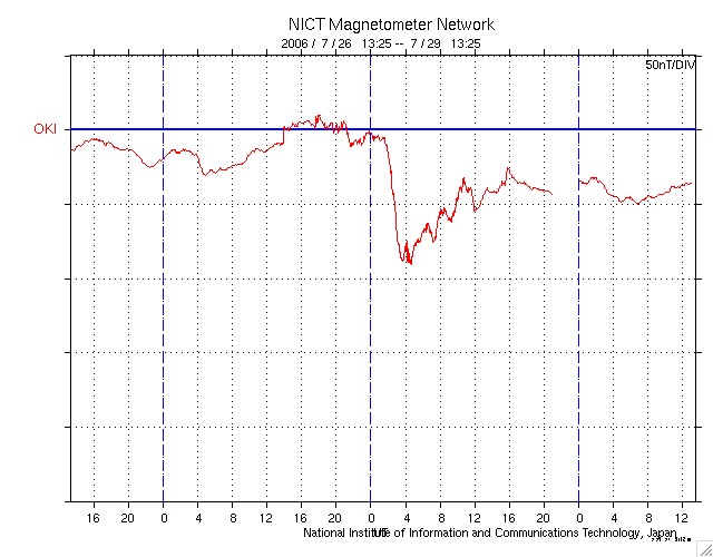 2006/ 7/29 22:22 更新 高速風は速度を下げ(500km/秒)、磁気嵐などは終息に向かっています。 担当 篠原 ヤップ島から最後の書き込みです。 この1週間、観測データや日付からも隔絶された様な状態でした。 宇宙天気の流れが見えなくなっていますので、今日の分析は読みづらいかもしれません。 太陽風の変化は前周期とずいぶん様相が変わって、昨日、28日に速度700km/秒に達する高速風が来ました。 このため、磁気圏では磁気嵐が発生し、京都大学のDst指数では-100nTを越える変化を観測しています。 同様の変化は沖縄の磁場グラフでも見ることができます。 高速風は、700km/秒に達した後どんどん速度を下げ、1日ほどで500km/秒になりました。 依然高速ですが、磁場強度が4nTとすっかり弱まっているので、 地球への影響は小さくなっています。 オーロラ活動を示すAE指数は、小規模の変動が所々ある程度で、全体的に穏やかになっています。 また、磁気嵐も、基本的に終息に向かっています。 今回の高速風はこれで一段落着きそうです。 しかし、次の高速風がすぐそこに迫っています。 SOHO衛星のEIT284の太陽写真を見てください。 中心に大きく黒いコロナホールが見えています。 右端は既に中心を過ぎている事から、これから3日かからずに次の高速風がやってきそうです。 27日周期の図では、明後日、31日に磁場強度の強まりが始まり、 日本時間の8月1日くらいから(27日の図では、31日の後半から)、速度の上昇が始まりそうです。 前回は600km/秒を越える高速風が、2日ほど続きました。 太陽では、901黒点群が小さな姿を見せているだけで、 X線のグラフにはほとんど変化がなく、穏やかな状態が続いています。 SOHO衛星のEIT284カメラの映像 (c) SOHO (ESA & NASA)