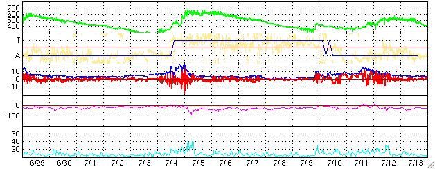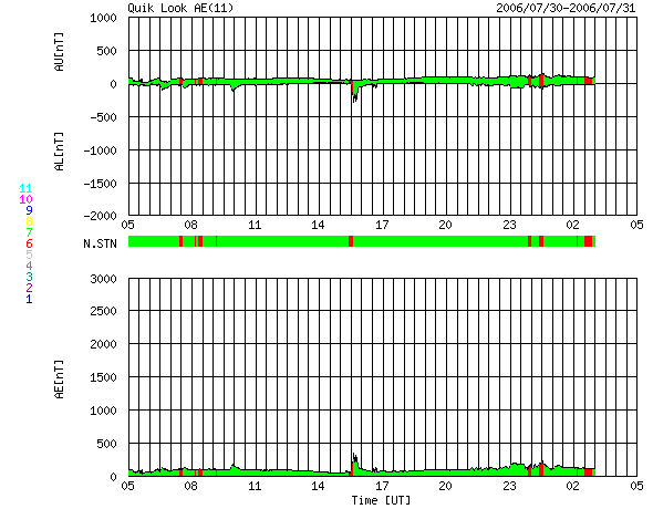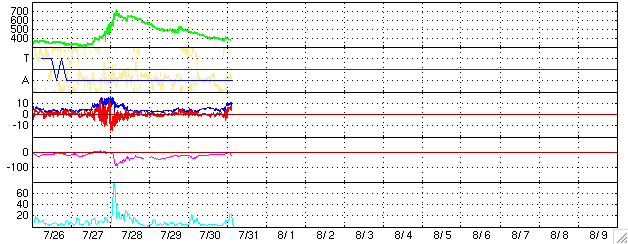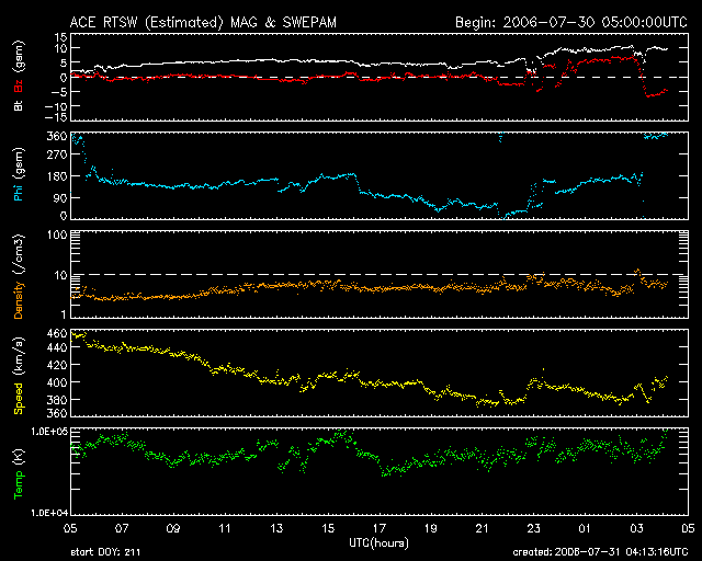 2006/ 7/31 13:15 更新 太陽風は通常の速度です(400km/秒)。太陽風の磁場強度が強まっており、これから高速風が始まりそうです。 担当 篠原 コロナホールによる、高速太陽風が間もなくやってくる様です。 ACE衛星の観測によると、太陽風の磁場強度が31日7時(世界時30日22時)頃から増加を始め、 通常レベルの5nTから10nTへ強まっています。 この様な変化は、コロナホールによる回帰性の高速風の始まりでよく見られます。 SOHO EIT284の写真が更新されていないので、GOESのX線写真を強調処理して、 コロナホールの位置を見ます。 すると、太陽の西側(右側)半分くらいのところに達しており、そろそろ高速風が始まってもよい頃です。 27日周期の図を見ると、前周期は半日ほどかけて650km/秒程度まで速度が上昇し、 高速風は3日ほど続きました。 今回も、同程度の高速風帯が見られるのではないでしょうか。 太陽風の磁場強度が強まっているため、南北成分が大きく南を向き、磁気圏活動を強める可能性が出ています。 ACEの図の最新の部分でも、-5nTの大きめの南向きになっています。 南寄りの傾向が続くと、今後の速度上昇に伴って、磁気圏活動が一気に活発化する可能性があります。 オーロラ活動が活発になり、磁気嵐が発生したりします。 これから明日、明後日にかけて注意が必要でしょう。 昨日より現在までは、太陽風は通常レベルの速度(400km/秒)でした。 磁場の南北成分はほとんど0nTで、磁気圏は概ね静穏でした。 太陽のフレア活動も静穏です。 黒点群は901黒点群と、その左下に新しく902黒点群ができています。 どちらも小さく、フレア活動はほとんど見られません。 引き続き穏やかな状態が続くでしょう。 GOES衛星のX線カメラで撮影した太陽の様子。コロナホールを見るために強調処理をしている。31日13時 (世界時30日04時)。 (c) NOAA/SEC ![]() ACEが観測した太陽風の磁場(1番上の枠、白線は全体の強度、赤線は南北成分) および、太陽風の密度(3番目の橙線)、速度(4番目の黄線) (c) NOAA/SEC ![]() リアルタイムAE指数 下段のAEグラフの値が高くなると、オーロラ活動が活発化しています。 (c) 京都大学, NICT ![]() 27日の太陽周期に合わせたデータプロット (太陽風版) 太陽が同じ面を地球に向けていた27日前の変化から、今後を予想することができます。 (c) NICT