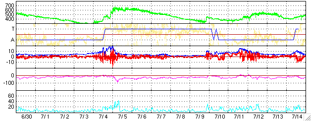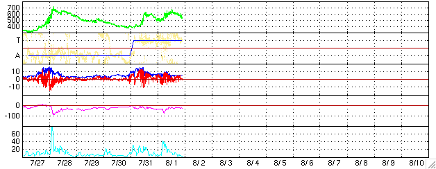 ACEが観測した太陽風の磁場(1番上の枠、白線は全体の強度、赤線は南北成分) および、太陽風の密度(3番目の橙線)、速度(4番目の黄線) (c) NOAA/SEC ![]() リアルタイムAE指数 下段のAEグラフの値が高くなると、オーロラ活動が活発化しています。 (c) 京都大学, NICT ![]() 27日の太陽周期に合わせたデータプロット (太陽風版) 太陽が同じ面を地球に向けていた27日前の変化から、今後を予想することができます。 (c) NICT