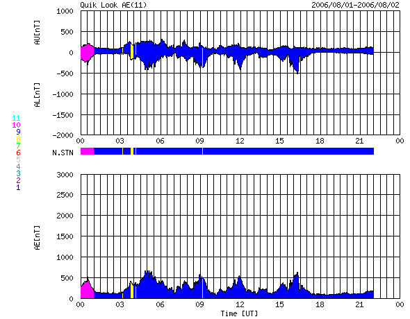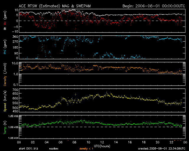2006/ 8/ 2 08:36 更新 太陽風の速度が再び上昇し(最高650km/秒)、磁気圏はやや活発な状態になっています。 担当 篠原 太陽風の速度が再び上昇し、高速の状態が続いています。 7月31日の夕方から始まった最初の高速風は、 半日ほどで速度が500km/秒を切るくらいに下がってしまいました。 しかし、8月1日12時(世界時1日2時)より再び上昇が始まり、 1日22時(世界時1日13時)には650km/秒近くまで速度が上がりました。 その後速度はゆっくりと下がっていますが、 最高速から半日ほど経った現在も550km/秒と高速の状態が続いています。 昨日のSOHO EIT284の写真でコロナホールが西側半分のところに見られましたが、 高速風領域は十分な広さを保っていた様です。 今日のEIT284の写真では、手前の明るい活動領域の影になってコロナホールは見えにくくなっていますが、 まだ、十分地球への影響領域に見えています。 今日いっぱいか、明日くらいまで、速度のやや高い状態が続くのではないでしょうか。 オーロラの活動度を示すAE指数のグラフは、500nTの比較的小規模の変動が度々見られていますが、 全体的に大きな磁気圏活動には繋がっていません。 太陽風の速度は高まりましたが、太陽風磁場の南北成分はどちらかというと北寄り傾向にあったことと、 南向きの部分もありますが、そこでは速度が低めだったりしたためでしょう。 引き続き太陽風が高速の間は、磁気圏もやや活発な状態が続く可能性があります。 太陽のフレア活動は静穏です。 901, 902の両黒点群は、掲載している写真ではほとんど見えなくなっています。 また、やがて西側に沈みますので、太陽は黒点の無い状態になるかもしれません。 SOHO衛星のEIT284カメラの映像 (c) SOHO (ESA & NASA)