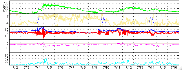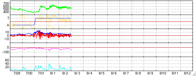 ACEが観測した太陽風の磁場(1番上の枠、白線は全体の強度、赤線は南北成分) および、太陽風の密度(3番目の橙線)、速度(4番目の黄線) (c) NOAA/SEC ![]() リアルタイムAE指数 下段のAEグラフの値が高くなると、オーロラ活動が活発化しています。 (c) 京都大学, NICT ![]() 27日の太陽周期に合わせたデータプロット (太陽風版) 太陽が同じ面を地球に向けていた27日前の変化から、今後を予想することができます。 (c) NICT