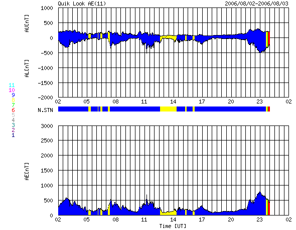 2006/ 8/ 3 10:47 更新 高速の太陽風が続いています(550km/秒)。オーロラ活動もやや活発です。 担当 篠原 高速の太陽風が続いています。 昨日より、太陽風の速度は550km/秒前後でほぼ安定しています。 太陽風磁場の強度(ACEの図の白線)は5nT。 南北成分(赤線)が南北に振動をするようになっています。 この影響で、太陽風の磁場が南を向いた(赤線がマイナスになった)ときに磁気圏にエネルギーが流入し、 オーロラ活動を頻繁に起こしています。 AE指数を見ると、300nTから700nTくらいの小・中規模の変動が連続的に観測されています。 今回の高速風太陽風は後半を迎えていると思われます。 27日周期の図を見ると、前周期も今日いっぱいくらいで高速風は終わりを迎えています。 今回も同様に、これから時間とともに太陽風の速度は下がって行くでしょう。 オーロラの活動も、それとともに穏やかになって行きます。 SOHO EIT284の写真には、次のコロナホールが見えて来ました。 太陽の中心から南に寄った(下に寄った)ところにあります。 これを27日前の写真(7月6日)と比較すると、コロナホールの位置が微妙に変わっているのが分かります。 やや西側(右側)に進んでいるようです。 太陽風の吹き方も変わって来るかもしれません。 さて、高速風の後につきものの、放射線帯高エネルギー電子の密度が増加しつつあります。 今のところ10の3乗近くまで増加し、明日にかけてもう一段増加するのではないかと思います。 警戒ライン(10の4乗の線)まで上がるかどうかは微妙ですが、今後の変化に注目してください。 太陽のフレア活動は静穏です。 掲載の写真では、902黒点群は見えなくなり、 その一方、太陽の西側半分付近に小さな黒点がひとつ見えている様です。 いずれにせよ、太陽の活動は穏やかな状態が続くでしょう。 SOHO衛星のEIT284カメラの映像 (c) SOHO (ESA & NASA)