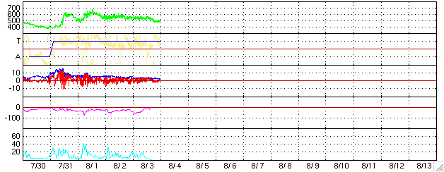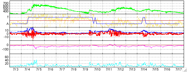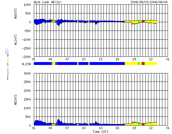 ACEが観測した太陽風の磁場(1番上の枠、白線は全体の強度、赤線は南北成分) および、太陽風の密度(3番目の橙線)、速度(4番目の黄線) (c) NOAA/SEC ![]() リアルタイムAE指数 下段のAEグラフの値が高くなると、オーロラ活動が活発化しています。 (c) 京都大学, NICT ![]() 27日の太陽周期に合わせたデータプロット (太陽風版) 太陽が同じ面を地球に向けていた27日前の変化から、今後を予想することができます。 (c) NICT