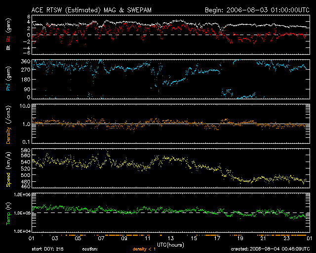 2006/ 8/ 4 09:48 更新 太陽風の速度が下がり始め、500km/秒を切っています。磁気圏は穏やかです。 担当 篠原 地球は太陽風の高速領域から抜け出しつつあります。 昨日より550km/秒で推移していた太陽風の速度は、 4日0時(世界時3日15時)頃から下がり始め、現在は500km/秒を切るくらいに下がっています。 依然やや高速のレベルではありますが、これから更に下がって、 高速風は終わりを迎えるでしょう。 今回の高速風の変化を前回の変化と比較すると(27日周期の図)、 最高速がやや下がりはしたものの(650km/秒→600km/秒)、 継続期間は4日程度となり、あまり変わりませんでした。 この高速風は、また今月の終わりに地球方向に帰ってくるはずです。 そのとき、どのような姿になっているのか、楽しみに待ちたいと思います。 さて、高速風の後半を迎えて、太陽風磁場の強度は下がり始めています。 3nTから、やや切るくらいに弱まっています。 南北成分は細かく振動していますが、振幅が小さくなっているため、 南を向いてもあまり影響がありません。 オーロラの活動度を示すAE指数のグラフには小さな変動がいくつか見える程度です。 この後、速度が下がって行きますので、磁気圏は静穏な状態が続くでしょう。 SOHO EIT284の写真には、太陽の中心からやや南寄りに淡いコロナホールが見えています。 これまでを振り返ると、太陽のこの領域は、 コロナホールが小規模で淡く、回帰してくるたびに形が変化している印象があります。 それでいて、過去4周期ほどは600km/秒近い高速風が安定して繰り返されていた という領域です(前回は500km/秒止まりでしたが)。 昨日も書きましたが、今回はコロナホールが西側に移動して見えていて、 今日の写真ではもう2日程度で地球に影響が及びそうな様子です。 コロナホールの濃さから考えると、あまり大きな速度にはならないと思われますが、 さて、どうなるでしょうか。 放射線帯の高エネルギー電子は、増加していますが、 増え方は小さくなっていて、今回は警戒ラインには達しない様です。 1桁下の、10の3乗程度で終わりそうです。 太陽では、901, 902黒点群が没して、無黒点状態になりそうです。 X線のグラフもレベルがかなり落ちています。 穏やかな状態が続くでしょう。 SOHO衛星のEIT284カメラの映像 (c) SOHO (ESA & NASA)
