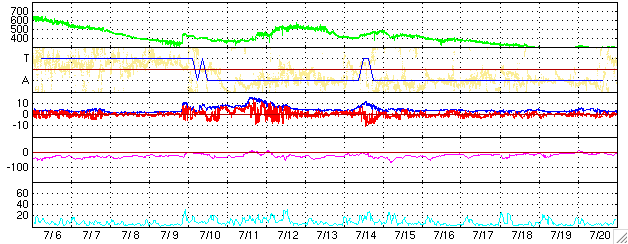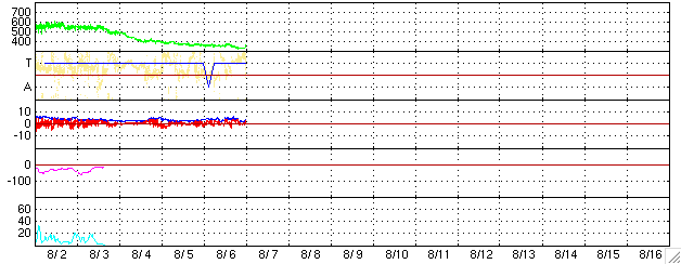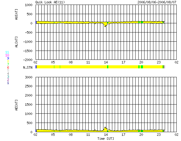 ACEが観測した太陽風の磁場(1番上の枠、白線は全体の強度、赤線は南北成分) および、太陽風の密度(3番目の橙線)、速度(4番目の黄線) (c) NOAA/SEC ![]() リアルタイムAE指数 下段のAEグラフの値が高くなると、オーロラ活動が活発化しています。 (c) 京都大学, NICT ![]() 27日の太陽周期に合わせたデータプロット (太陽風版) 太陽が同じ面を地球に向けていた27日前の変化から、今後を予想することができます。 (c) NICT