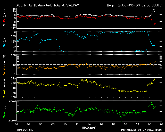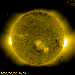 2006/ 8/ 7 10:05 更新 太陽風は低速で安定しています(360km/秒)。磁気圏は静穏です。 担当 篠原 太陽風は低速の状態が続いています。 速度は360km/秒前後でほぼ安定し、たいへん穏やかです。 SOHO EIT284の太陽写真を見ると、コロナホールはかなり西側に移動してしまい、 この部分からの直接の影響は発生しなかったようです。 磁気圏内も穏やかな状態が続いています。 地球から見ていると、太陽は約27日で一回転します。 そのため、太陽風の変化を見ていると、1周期=27日の周期で同じ変化を繰り返す傾向があります。 従って、現在のデータと27日前のデータを組み合わせて考えると、今後の変化がある程度予想できます。 そのための図が、27日周期の図です。 ここに掲載している短縮版の27日周期の図では、直前の周期のデータのみ掲載しています。 完全版の27日周期の図では、前の2周期分のデータを見ることができます。 これらの図を参照すると、前周期(7月12-14日)と、前々周期(6月15-18日)に、高速風の領域が見られます。 これは、更にその前の、5月18-21日、4月21-24日と、過去4周期にわたって見られていたものです。 この変化が今周期も引き継がれていると考えると、明日、8月8日くらいから始まることになります。 ただし、前回の変化では、高速風の規模が以前よりも弱まっていました。 また、現在の太陽写真を見ても(EIT284)はっきりとしたコロナホールは見られません。 従って、ここの高速風領域がどうなっているのか、今後の変化が注目されます。 ACE衛星の図の最新のところで、磁場強度が急に強まっています(13nT)。 これは一時的な乱れなのでしょうか、高速風の始まりと関連しているのでしょうか。 もうしばらく様子を見る必要があります。 太陽は無黒点のままです。 X線の強度も低いレベルで推移しており、穏やかな状態が続いています。 SOHO衛星のEIT284カメラの映像 (c) SOHO (ESA & NASA)