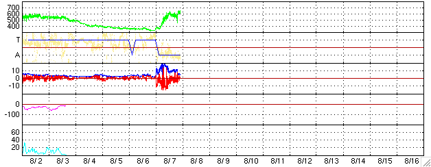 ACEが観測した太陽風の磁場(1番上の枠、白線は全体の強度、赤線は南北成分) および、太陽風の密度(3番目の橙線)、速度(4番目の黄線) (c) NOAA/SEC ![]() リアルタイムAE指数 下段のAEグラフの値が高くなると、オーロラ活動が活発化しています。 (c) 京都大学, NICT ![]() シベリアで観測された3日間の磁場データ 右側の3分の1が、昨日のデータになります。グラフが上がったり下がったりすると、オーロラ活動が活発化しています。 (c) NICT ![]() 27日の太陽周期に合わせたデータプロット (太陽風版) 太陽が同じ面を地球に向けていた27日前の変化から、今後を予想することができます。 (c) NICT